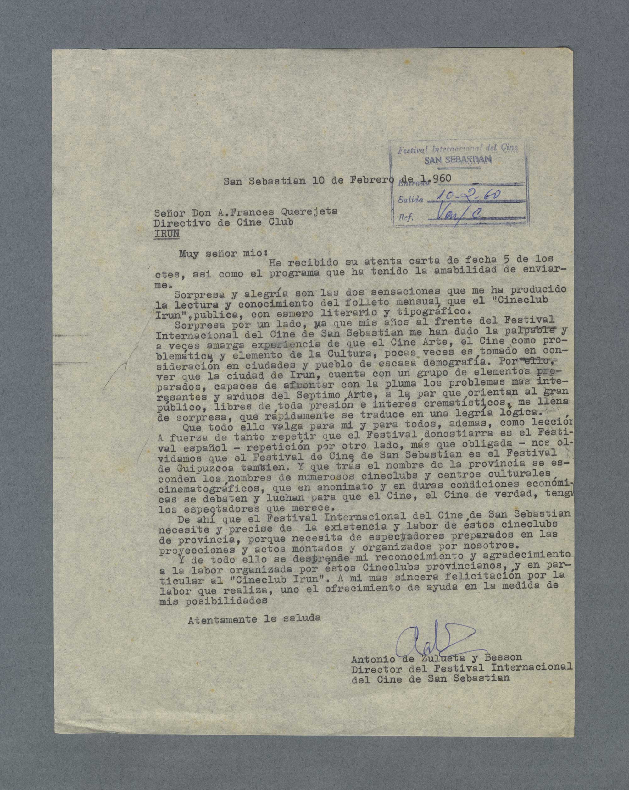 Zulueta responde con esta carta en la que celebra la existencia e incansable labor de los cineclubes guipuzcoanos, que “en anonimato y en duras condiciones económicas”, se dedican al intercambio de conocimientos cinematográficos y a la formación de públicos. La carta es un importante gesto de mutuo reconocimiento: el certamen garantizaba a los organizadores de distintos cineclubes y centros culturales el acceso a sus proyecciones y publicaciones y reconocía a su vez la necesidad de nutrirse de las audiencias educadas a lo largo del año por estas mismas asociaciones cinematográficas.