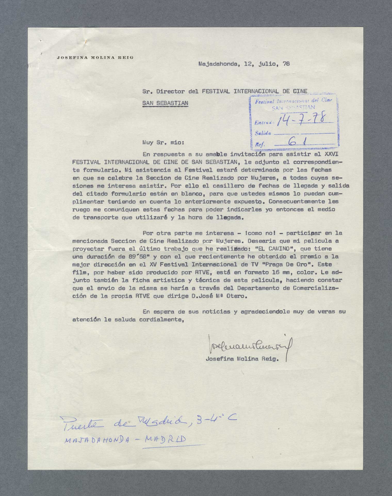 En julio de ese mismo año, Josefina Molina dirigió una carta a la organización del Festival con el mismo interrogante que el cineasta Antoni Padrós había planteado al certamen el año anterior: la posibilidad de proyectar su película en 16mm con el objetivo de ser incluida en la programación.