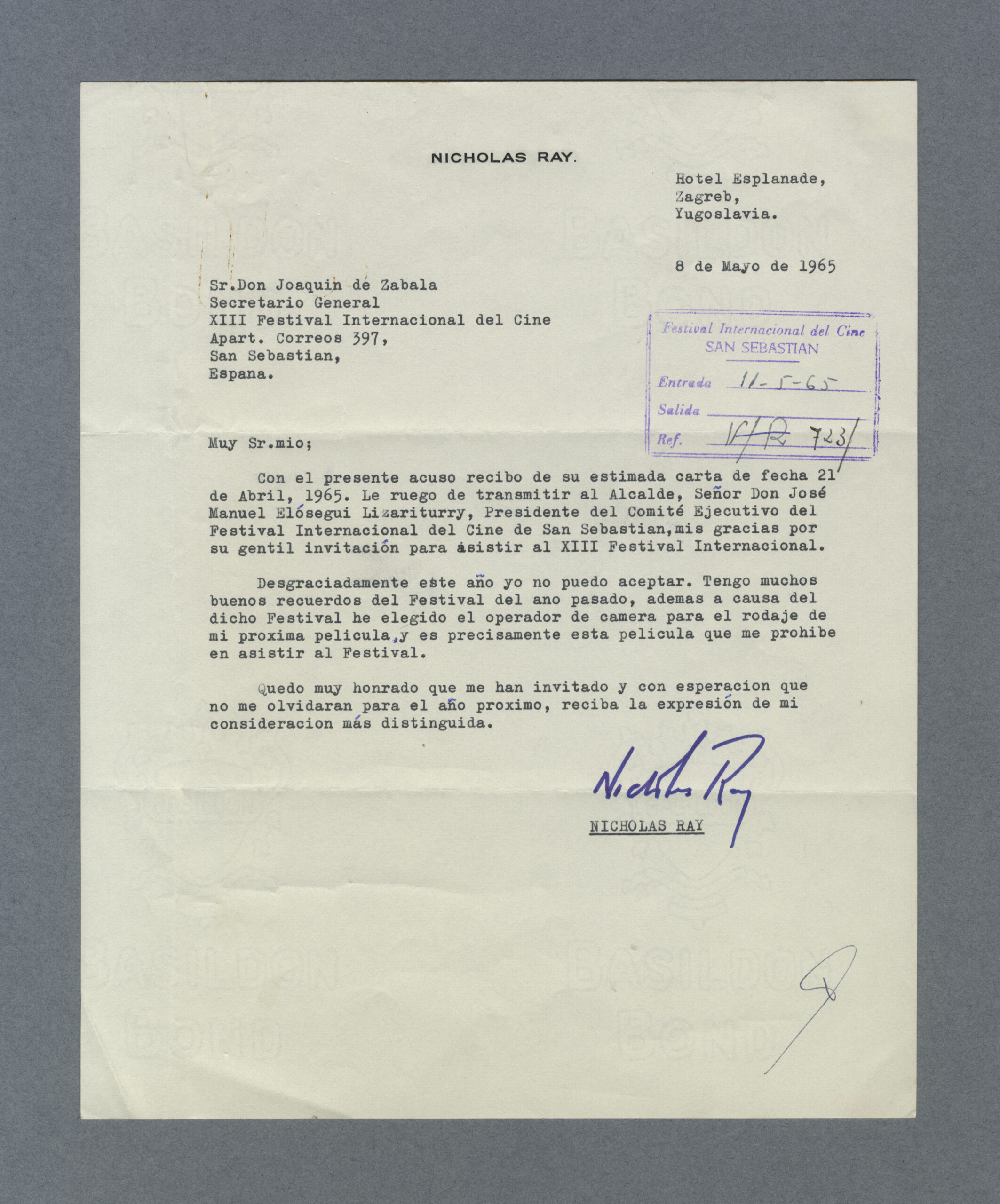 El archivo del Festival registra una carta de 1965, remitida desde la desaparecida República Socialista de Yugoslavia, en la que Nicholas Ray dibuja un escenario apasionante: durante su paso por el certamen donostiarra de 1964 habría conocido y decidido contratar al operador de cámara que lo acompañaría en su próximo proyecto. Una película que nunca llegó a existir.
