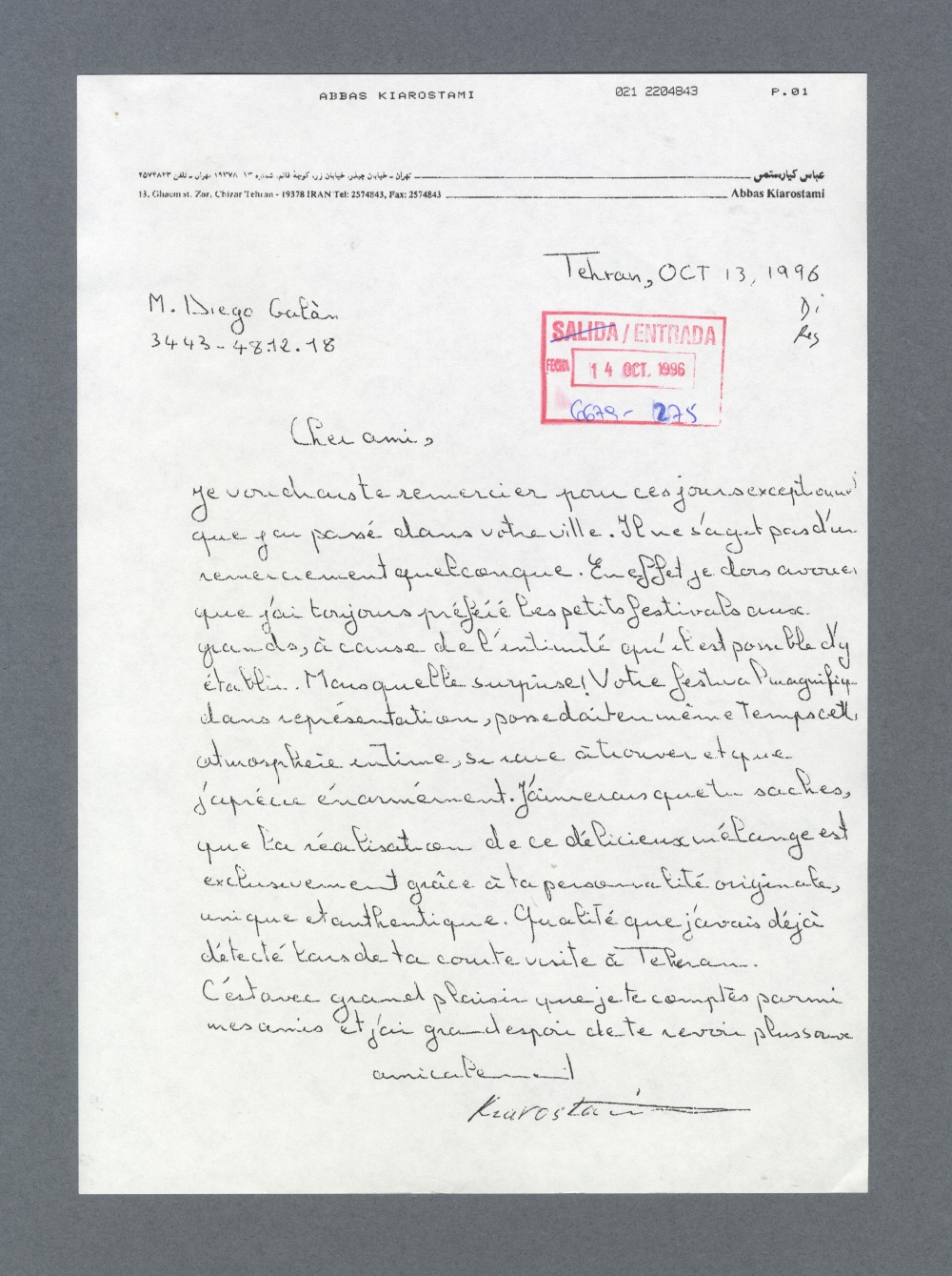 Su visita al certamen tardaría un año en producirse, pues, tal y como adelanta Kiarostami en su respuesta, la pre-producción de su siguiente película le obligaría a rechazar la invitación del entonces director del festival, Diego Galán, que aprovechaba sus primeras cartas para interesarse por su siguiente proyecto. Tal y como se desprende de la correspondencia posterior con el crítico iraní Mamad Haghighat, en febrero de 1996 se produce en Teherán el primer encuentro en persona entre Galán y el cineasta, en el marco del Festival Internacional de Cine de Fajr (FIFF), celebrado hasta hoy durante las fechas del aniversario de la revolución del ‘79. Haghighat, colaborador del festival árabe, era además crítico y corresponsal de la revista especializada Film, la publicación de cine más antigua de la Irán pos-revolucionaria, fundada en 1982, y que acogió entre sus filas a teóricos y cineastas como Kyomarth Pourahmad, Hamed Suleimanzadeh y al propio Abbas Kiarostami, que influirían con sus postulados en el devenir del cine árabe.