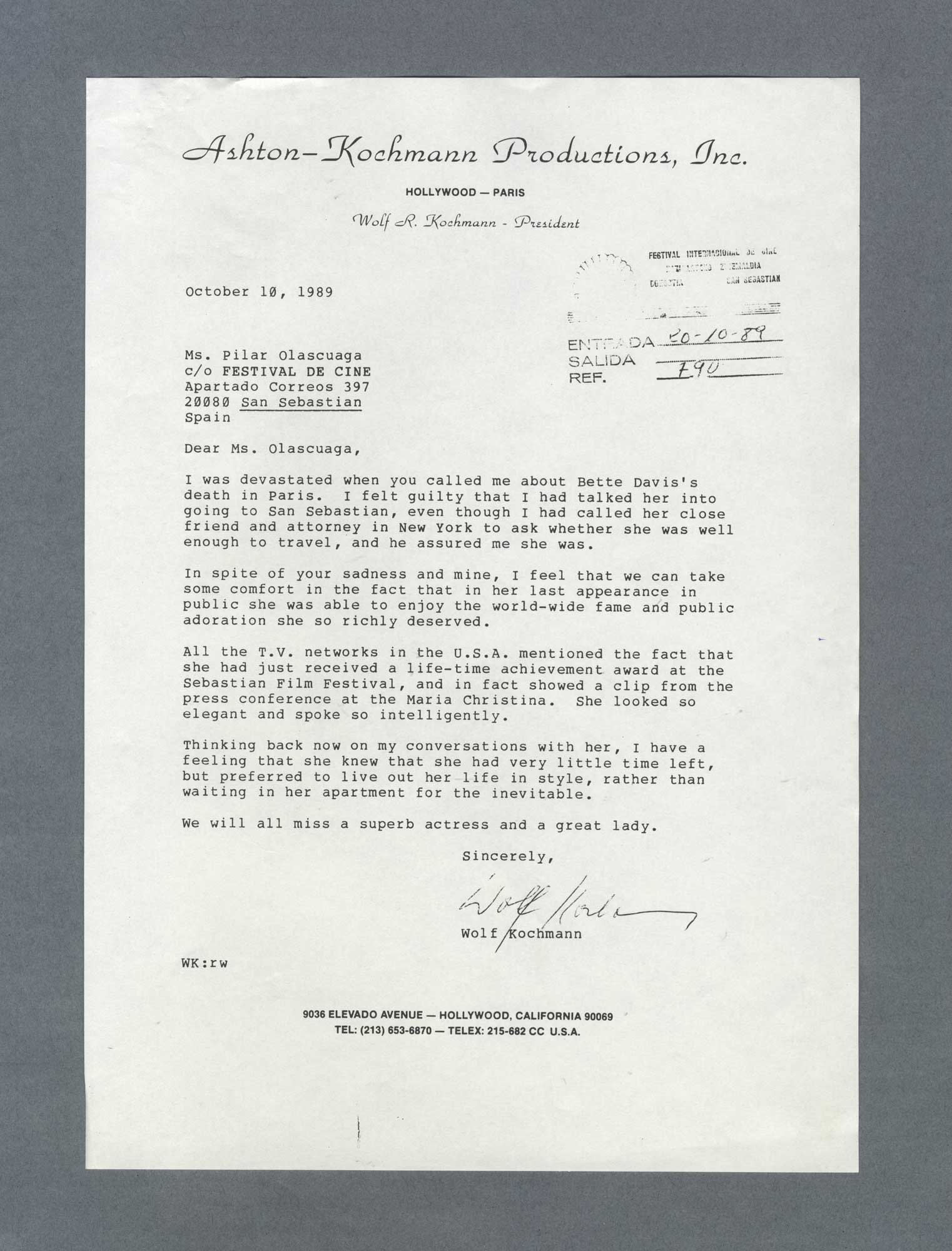 La negociación de su visita a San Sebastián se llevó a cabo gracias a la intermediación del productor Wolf Kochmann, quien diseñó, junto al equipo del Festival, una minuciosa agenda en favor de la debilitada salud de Davis, que Kathryn Sermak, su asistente personal, se encargaría de ejecutar: una rueda de prensa en la que se repasaría toda su trayectoria y su participación en la gala del Premio Donostia. Tal y como anuncia Kochmann en la carta que dirige a Pilar Olascoaga tras el fallecimiento de la actriz, la rueda de prensa que ofreció en el Hotel María Cristina fue emitida en todas las cadenas de televisión estadounidenses.