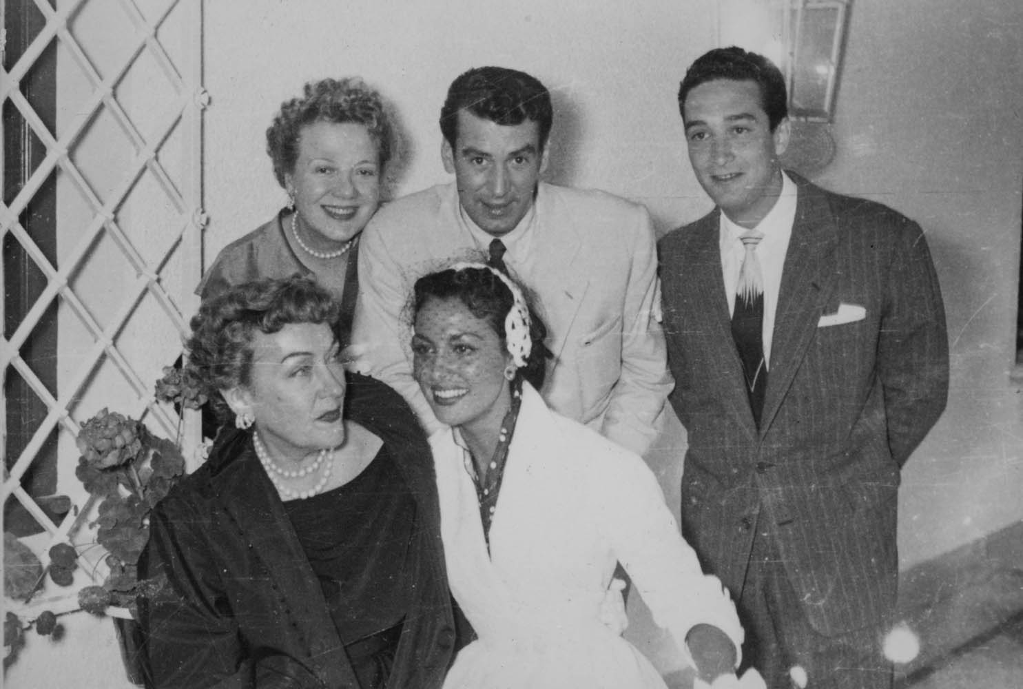 Inscripciones: "1 MARIKA ROKK / 2 P. DAMON / 3 / 4 G. SWANSON / 5 P. RICO" [Inscripción manuscrita en tinta azul, al verso de la copia] "1954" [Inscripción manuscrita en tinta azul, al verso de la copia] "1954" [Inscripción manuscrita en grafito, al verso de la copia] "1" [Inscripción manuscrita en tinta azul sobre etiqueta adhesiva, al recto de la copia]