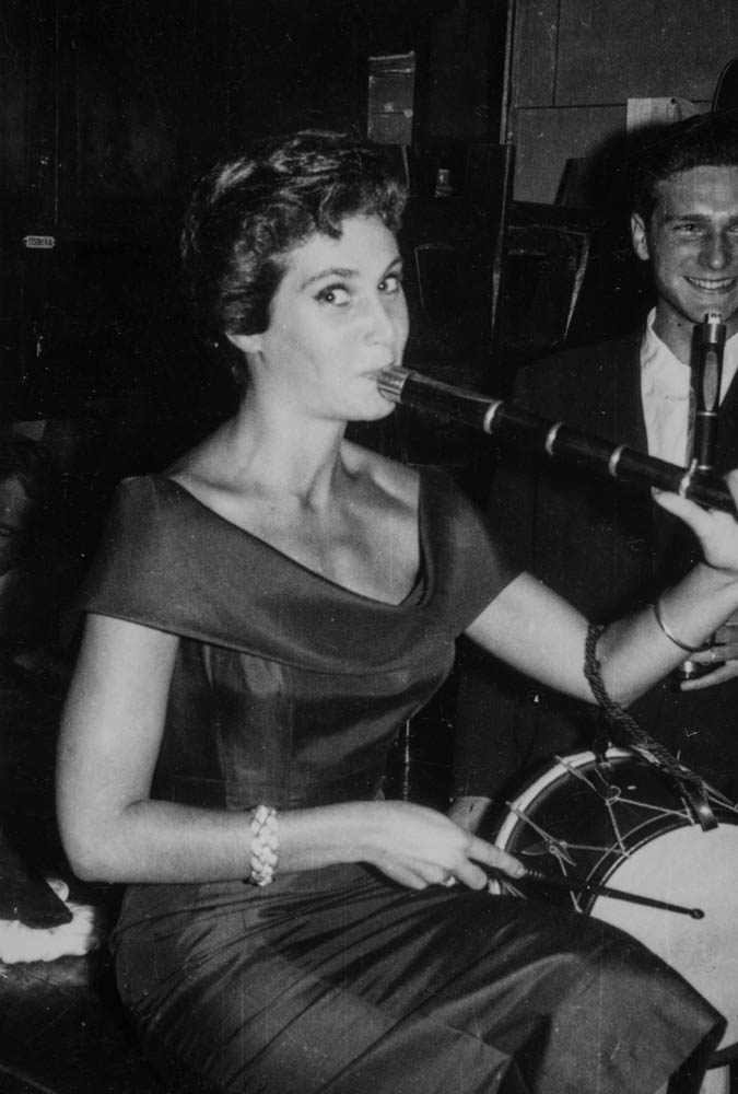 La actriz Rosita Arenas con un grupo de tamborreros en el interior de la Sociedad Gastronómica Gaztelubide durante una fiesta organizada por la delegación mexicana