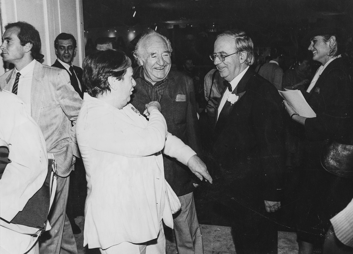 El alcalde de San Sebastián Ramón Labayen conversando con los poetas Gabriel Celaya y Amparo Gastón durante la Gala de Inauguración