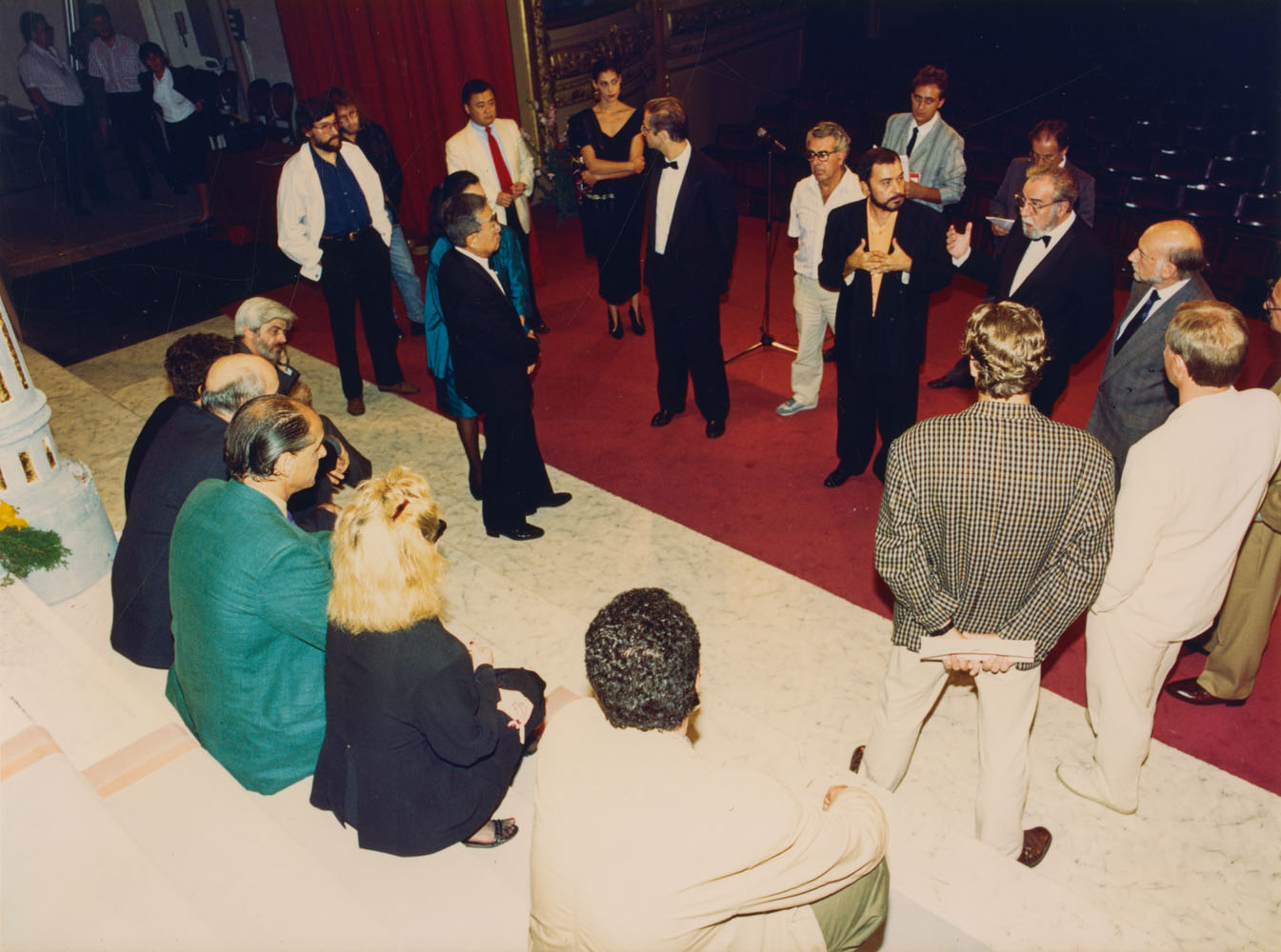 Alcance y contenido: Distintos miembros de la organización del Festival y del jurado de la Sección Oficial planificando la Gala de Clausura, en el escenario del Teatro Victoria Eugenia. En la fotografía, Diego Galán, delegado general del Festival, el actor Fernando Rey, la cineasta Ildikó Enyedi, las actrices Ingrid Caven y Maria Barranco y los directores Daniel Schmid, Robert Kramer, Otar Iosseliani, Felipe Cazals, Luis García Berlanga y Shoei Imamura y Jaime Azpilikueta director de la Gala