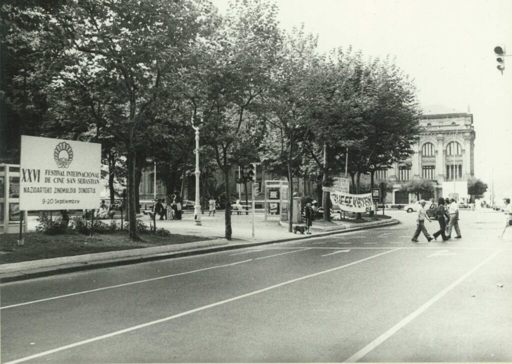 Se trata de una fotografía clasificada en una categoría aparentemente aséptica: las «Fotos de instalaciones», un registro de las sedes del Festival y los materiales promocionales que engalanaban la ciudad. Presumiblemente, el objetivo inicial de esta fotografía debía ser documentar el cartel anunciador del Festival de 1978 en el Boulevard. Sin embargo—desconocemos si por azar o de forma intencionada—la imagen compone una simetría perfecta entre el cartel oficial, en primer término, y una pancarta del movimiento Alde Hemendik /Que se vayan, en segundo plano. Este rastro de las luchas en curso, que quizá podría pasar desapercibido como «ruido de fondo», quedó marcado en nuestro imaginario: nos recordaba la importancia de prestar atención a los márgenes, a los segundos planos, a las acciones y gestos que el archivo no registra de manera «consciente» y cuya importancia solo cobra sentido desde la mirada futura que posibilita un archivo abierto.