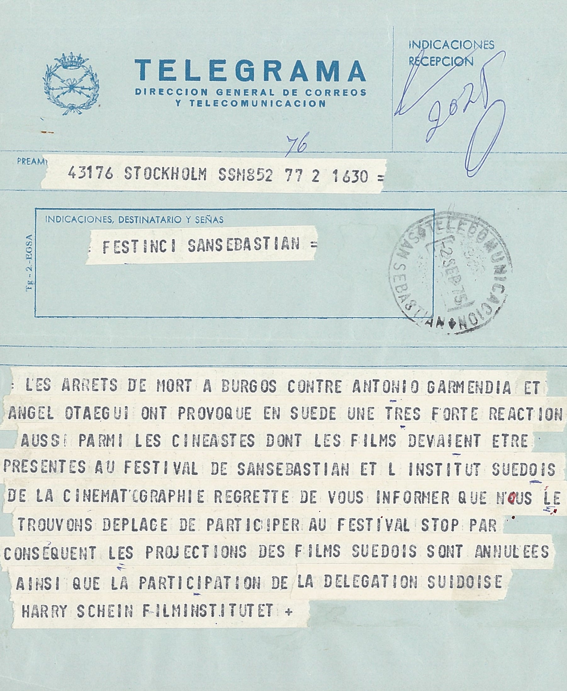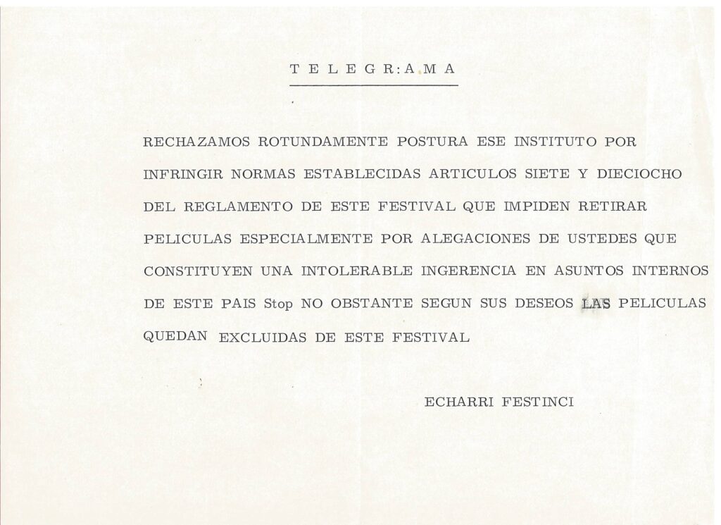 Mientras las luchas sesentayochistas redibujaban el atlas de los festivales internacionales, San Sebastián perpetuó su modelo de festival bajo estricto control de la administración franquista, representada por Miguel de Echarri, director del Festival entre 1967 y 1977. Aunque la sincronización con los intereses del régimen no pasó desapercibida ni para la disidencia antifranquista crecientemente radicalizada —en sus últimos años el Festival transcurrió bajo medidas de seguridad extremas— ni para muchos observadores internacionales. El archivo conserva los rastros de esta tensión. Por ejemplo, una serie de mensajes de repulsa contra el Festival enviados por varios invitados internacionales en 1975. Un telegrama remitido por Harry Schein, fundador y director del Instituto de Cinematografía de Suecia, anuncia la retirada de todas las películas suecas en protesta por la condena a muerte de los militantes antifranquistas Garmendia y Otaegi. La respuesta de Echarri deja clara la posición del Festival. Acata la retirada, pero no se priva de regañar a Schein por su «intolerable ingerencia [sic] en asuntos internos de este país».