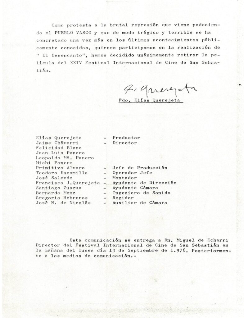 Por todo ello, el 13 de septiembre la dirección del Festival recibió una notificación firmada por Elías Querejeta y todo el equipo de El desencanto (Jaime Chávarri, 1976), en el que comunicaban la retirada de la película, programada en Sección Oficial. La decisión de Querejeta fue secundada por un nutrido grupo de periodistas que también abandonaron el festival.