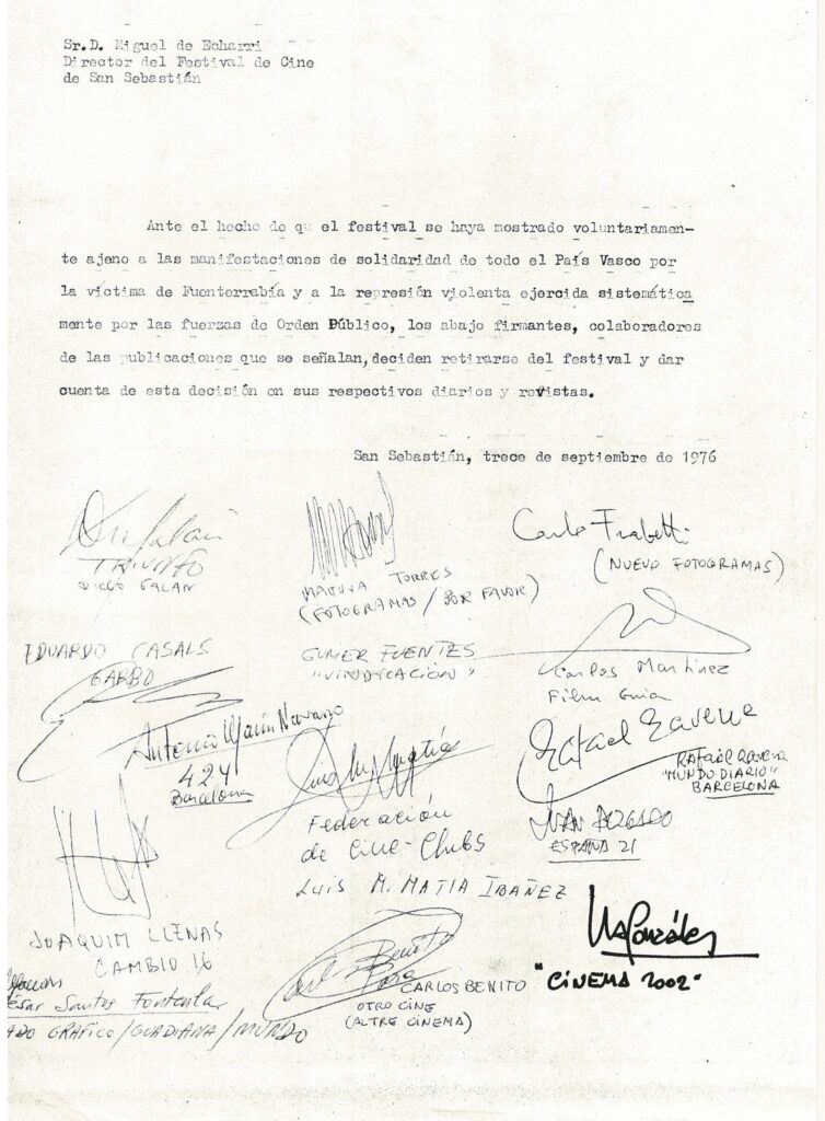 [14] «[Declaración de protesta contra United Artists]», s. f., AG.1977-78.145, Archivo Festival de San Sebastián. A los firmantes del borrador inicial (Rosa Montero, Román Gubern, Laura Betti, Eduardo Chillida, Ricardo Muñoz Suay o Elías Querejetas, entre otros) se sumaron otras figuras internacionales como Jean-Paul Sartre, Costa-Gavras o Elio Petri.