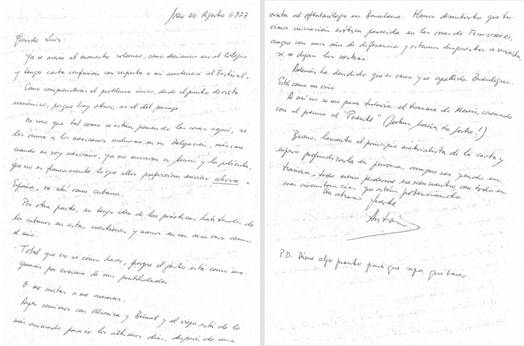 Ayer comimos con [Luis] Alcoriza y [Luis] Buñuel y el viejo está de lo más animado para ir los últimos días [a San Sebastián], después de una visita al oftalmólogo en Barcelona […]. Además, ha decidido que es vasco y se apellida Buñuelegui. Está como un crío.
