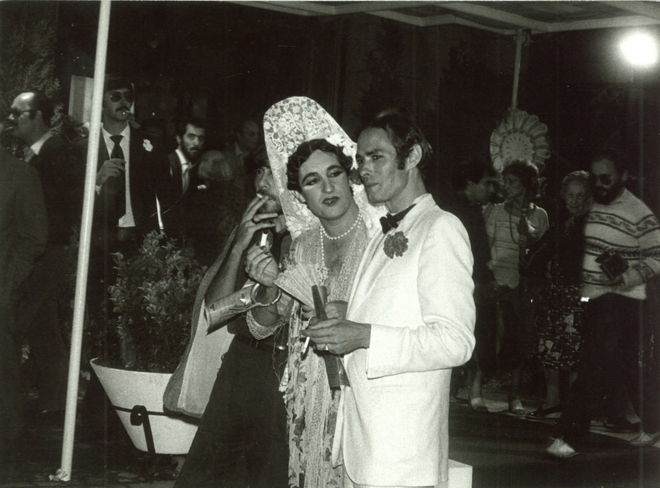 En esta fotografía, tomada en 1979 y ampliamente reproducida, vemos una escena clásica en la cultura visual de los festivales de cine: la entrada de personalidades en la alfombra roja. En este caso, el artista José Luis Pérez Ocaña accede del brazo del actor Pierre Clémenti al Victoria Eugenia, «el Palacio del Festival». Fiel a su propia práctica estético-política, Ocaña aparece travestido, con su característica apropiación de la estética de devoción religiosa popular.
