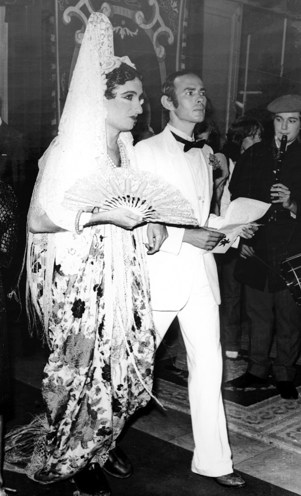 Cada detalle de esta escena describe un momento de tensión y ruptura: una profanación. El panfleto que lleva en su mano Clémenti, en el que se distingue el emblema de las Gestoras Pro-Amnistía, nos permite imaginar, pocos segundos antes de que estas fotografías fueran tomadas, el encuentro y quizá la conversación entre los artistas y los activistas que con total seguridad se manifestaban a las puertas del teatro. Pero, sobre todo, el encuentro entre Ocaña y las floristas—encargadas de prender una flor en la solapa de los caballeros que entraban al foyer, ahora paralizadas—desmonta todo un sistema de clasificación de género codificado en rituales de gala por la vía de la acción directa.