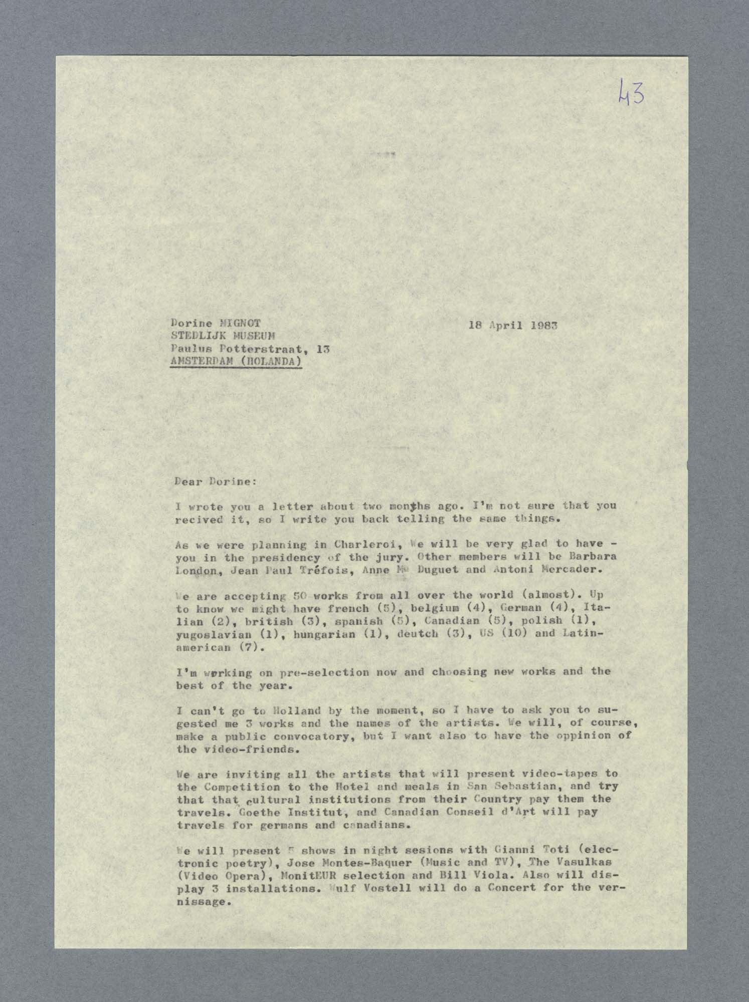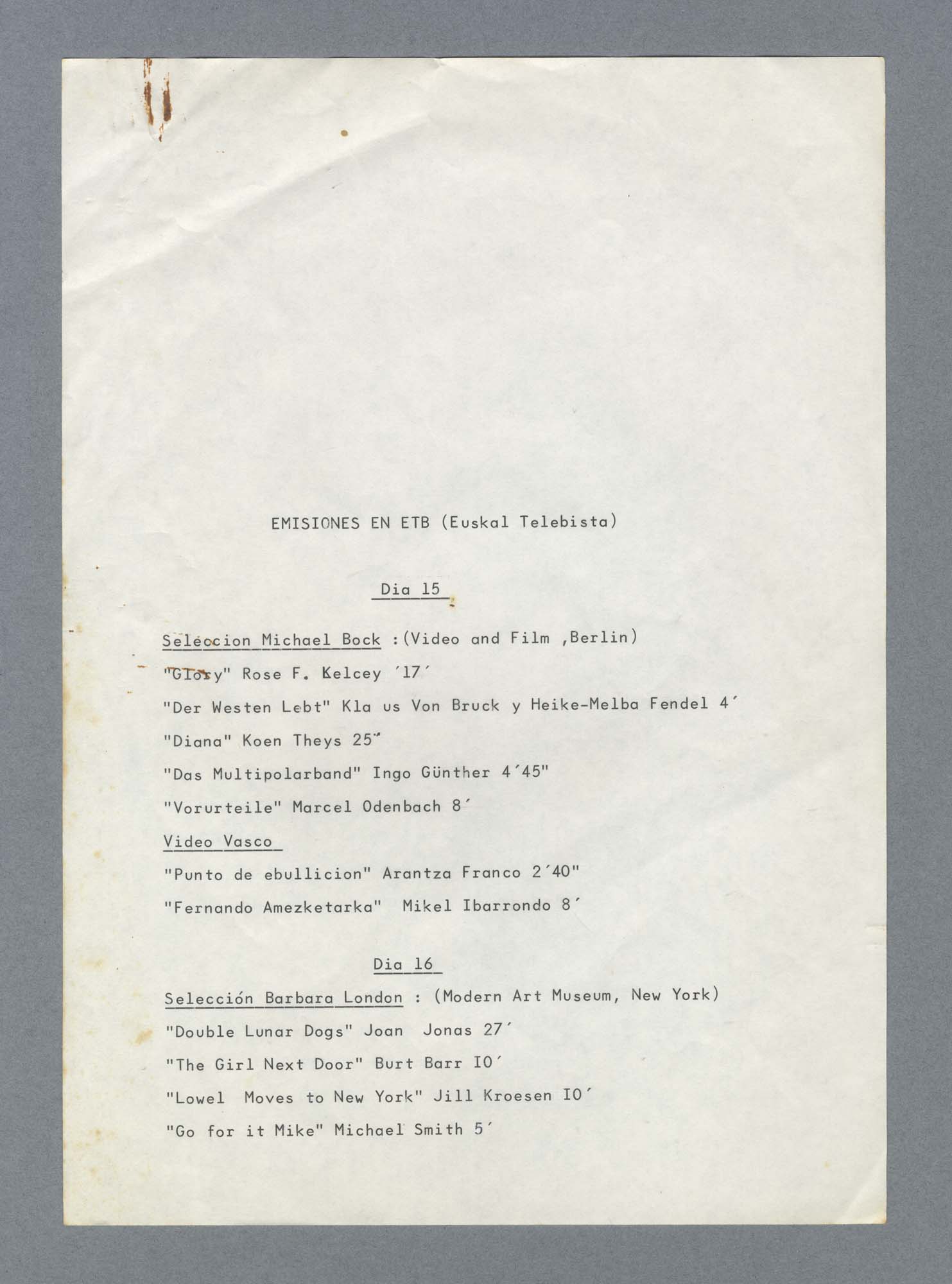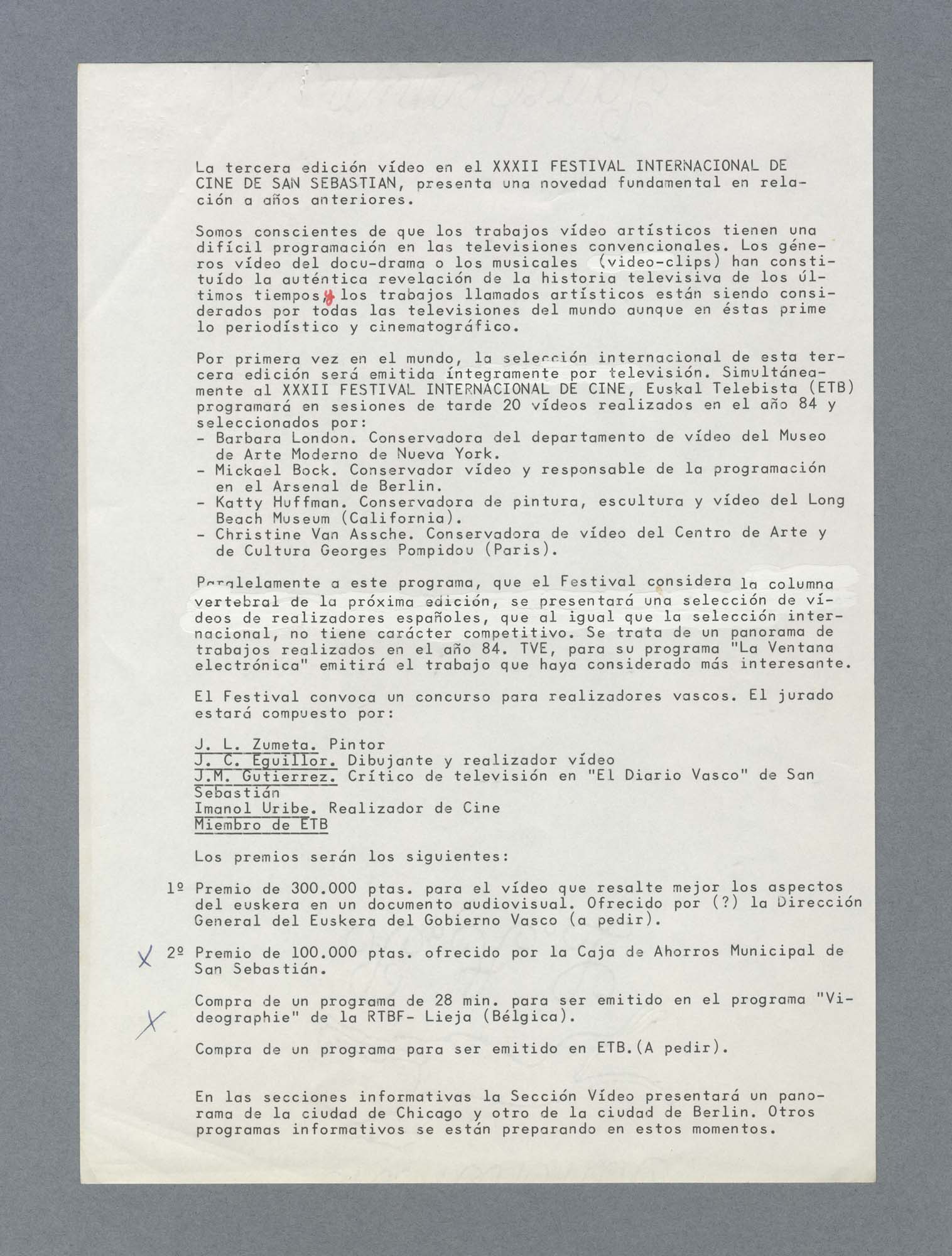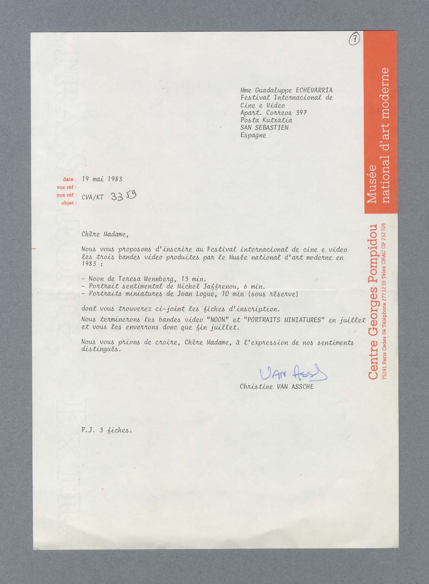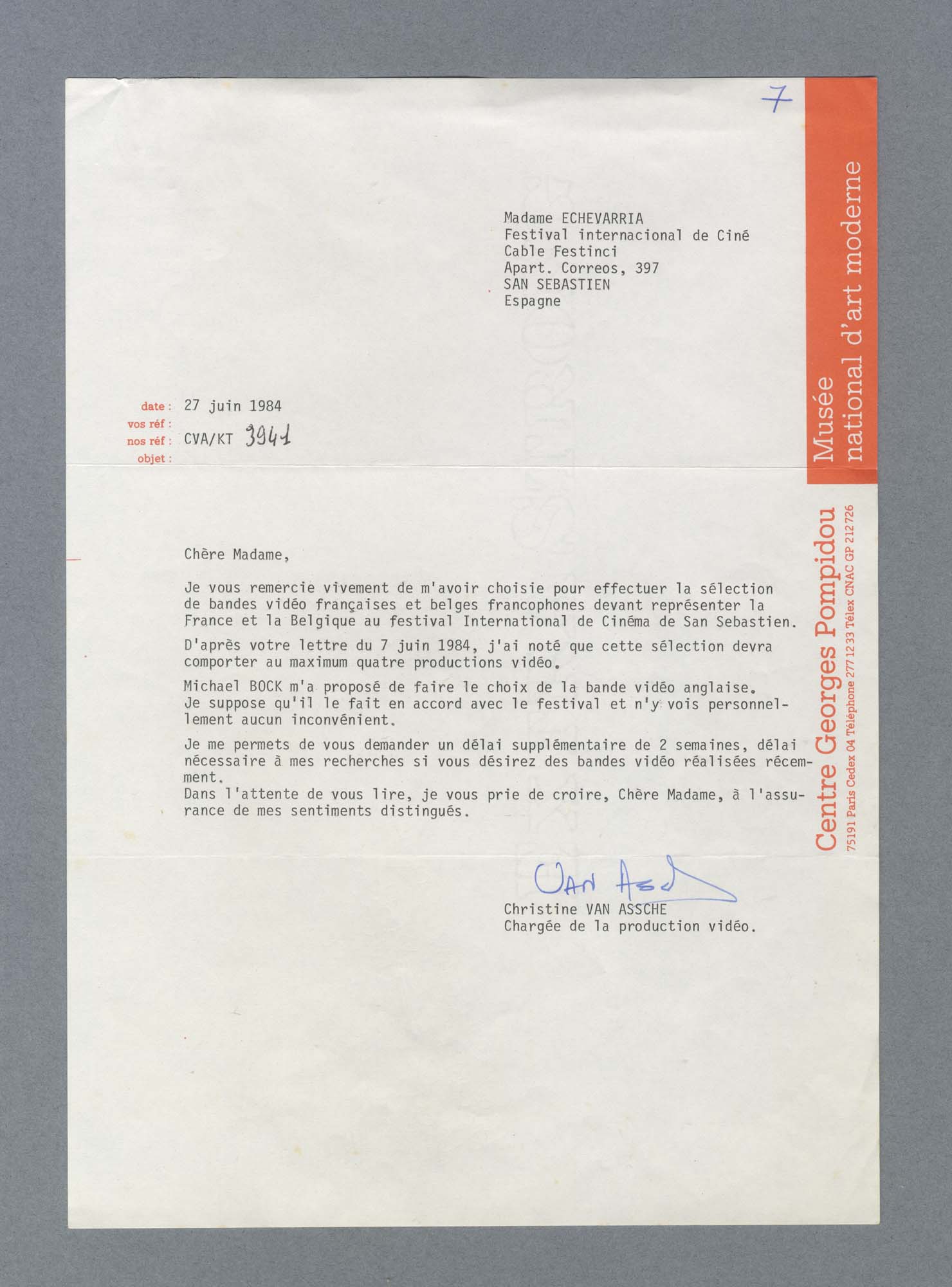 Carta de Christine Van Assche a Guadalupe Echevarria el 27 de junio de 1984 en la que acepta el encargo de seleccionar cintas francesas y belgas para la tercera edición del Festival de Video. En el documento que adjunta se puede ver esta selección final, que se emitió al mismo tiempo en el festival y en la EITB, destacando que esto es algo que ocurre “por primera vez en el mundo”. También aparecen la selección que hicieron Barbara London (EE.UU.), Michael Bock (Berlín) y Kathy Hauffman Archivo Festival de San Sebastián.