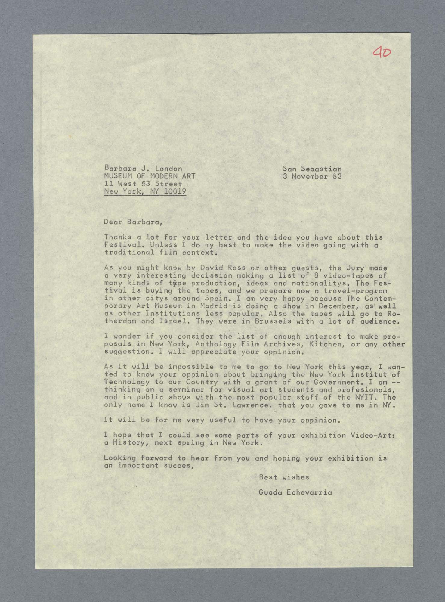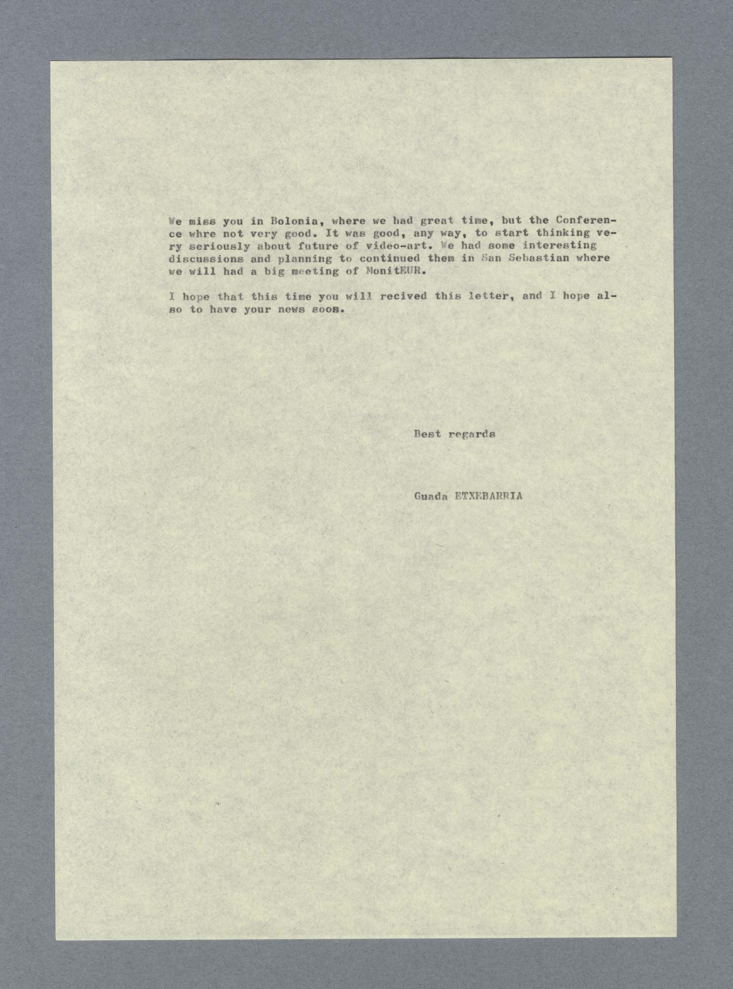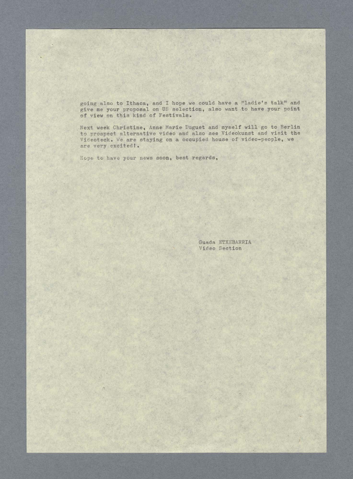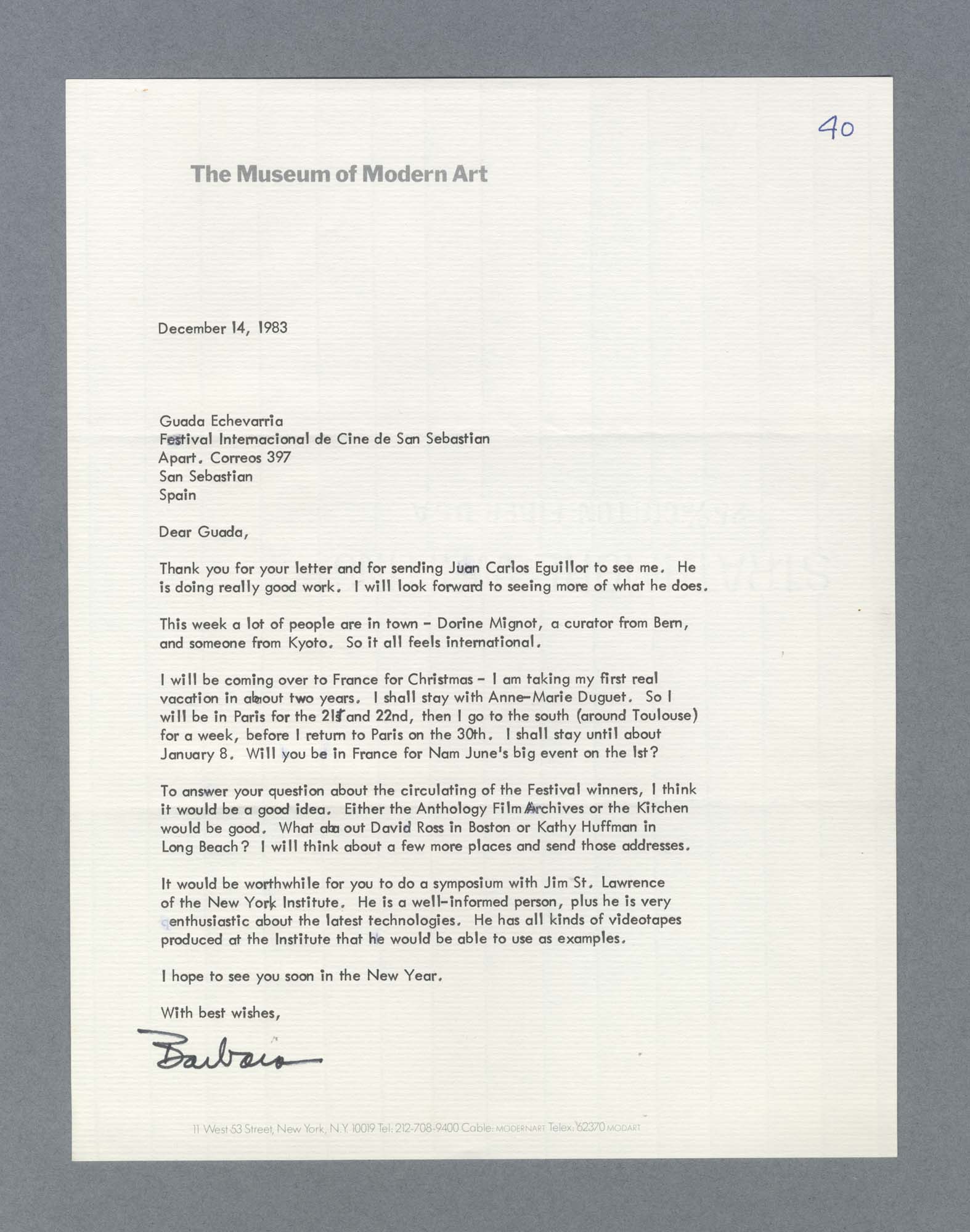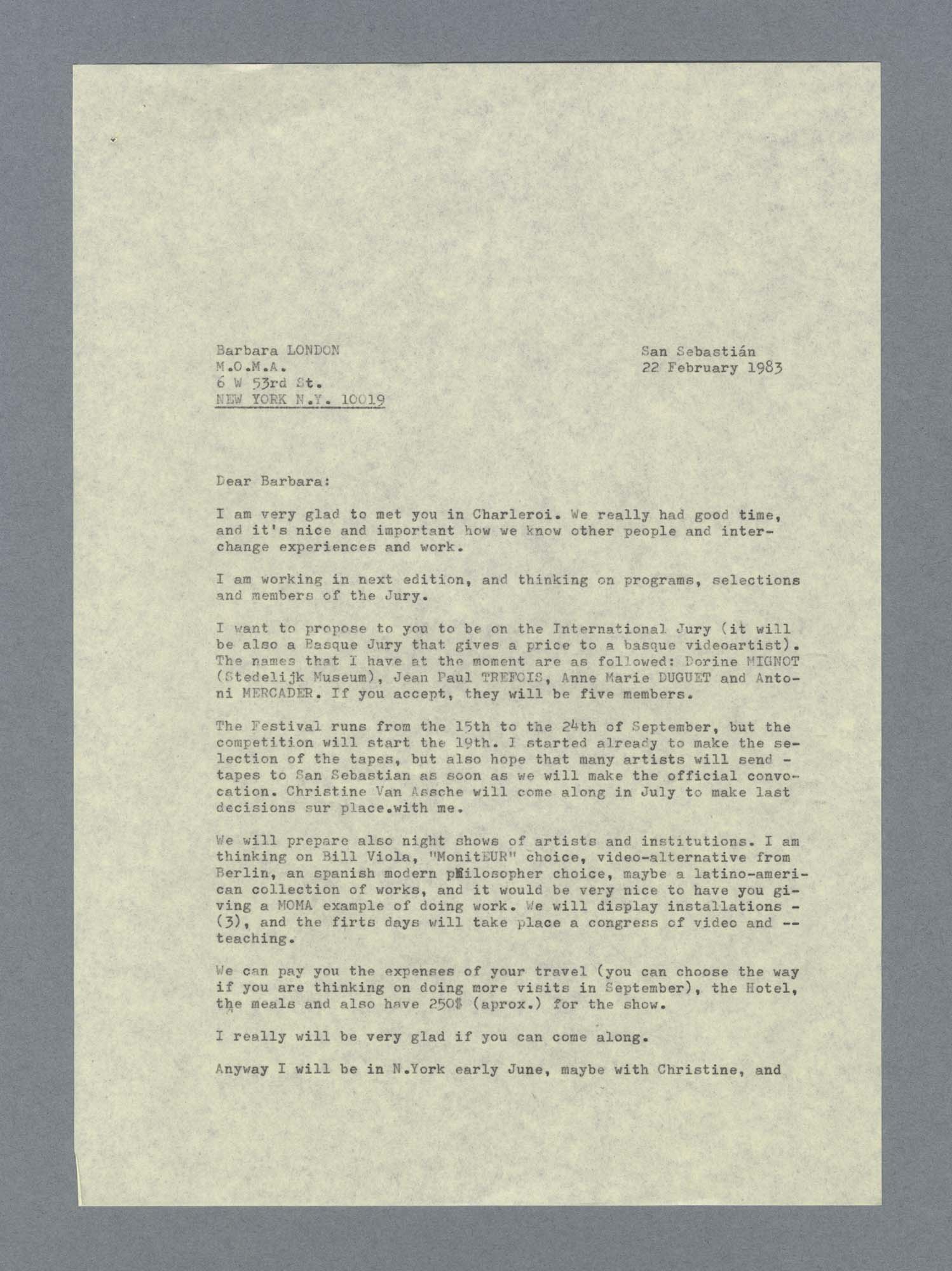 Correspondencia entre Guadalupe Echevarria y Barbara London, curadora de la colección de video del MoMA de Nueva York. En la primera carta, Echevarria invita a la estadounidense a participar como jurado y a mostrar cómo trabajan en el de la II edición del Festival de Video tras haberla conocido en el Festival de Charleroi, y le asegura que “es bonito e importante como conocemos a otras personas e intercambiamos experiencias y trabajos”. En esta carta, además de pedirle opinión sobre cintas estadounidenses y sobre la situación de los festivales, también es posible observar que el nombre de Christine Van Assche aparece como acompañante de Echevarria en busca de cintas de videos. En la siguiente correspondencia, ambas se intercambian referencias de artistas e ideas para sus correspondientes lugares de exhibición. En las cartas destacan otros nombres habituales dentro del archivo, como la ya mencionada Dorine Mignot o la teórica de video Anne-Marie Duguet. Archivo Festival de San Sebastián.