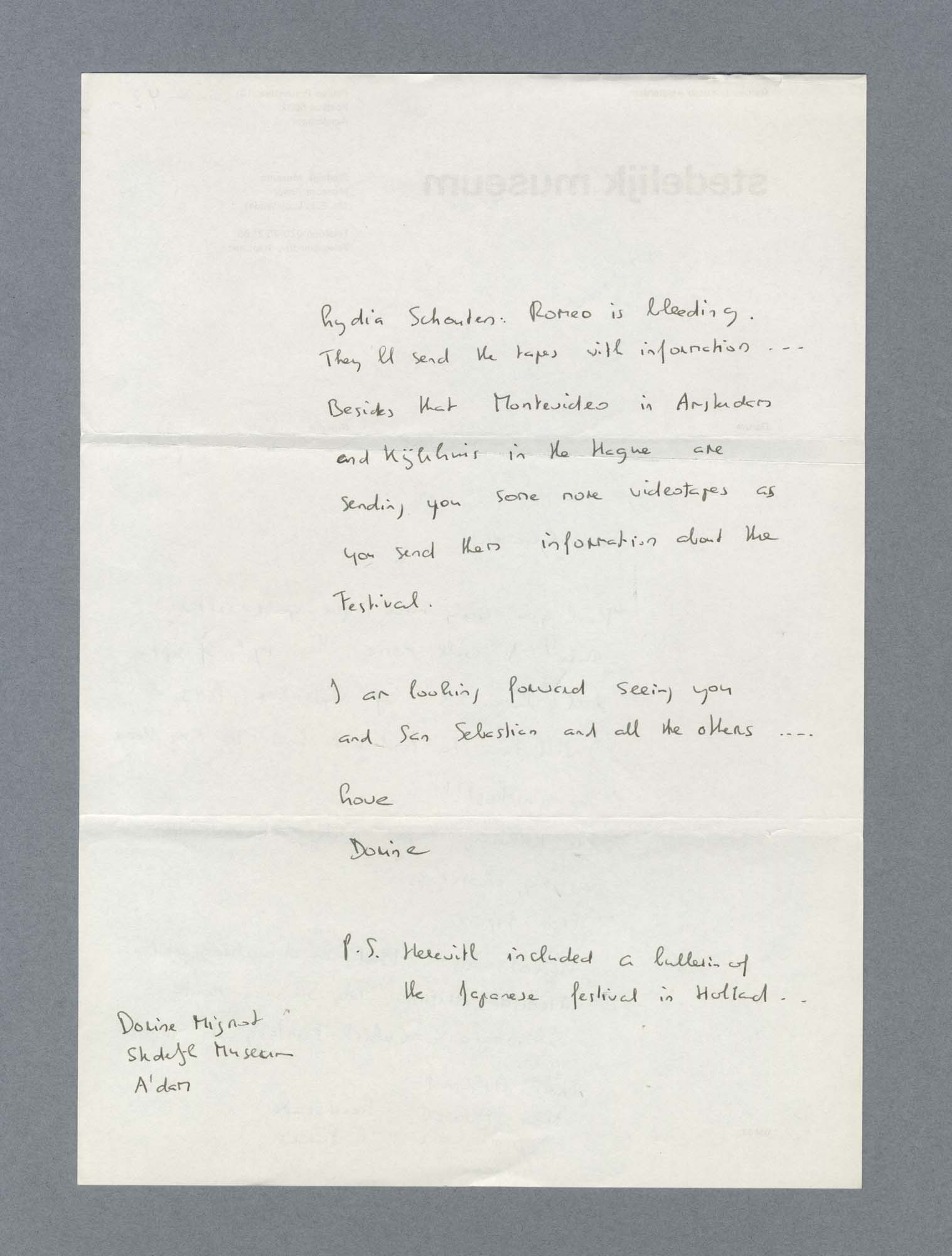 Una de estas colaboradoras era Dorine Mignot, curadora del Stedelijk Museum en Amsterdam. En esta correspondencia se aprecia la petición de obras por parte de Echevarria a la curadora neerlandesa y las obras que ésta recomienda en su respuesta. El tono de la carta de Echevarria, a pesar de tratarse de algo profesional, es bastante coloquial. Archivo Festival de San Sebastián.