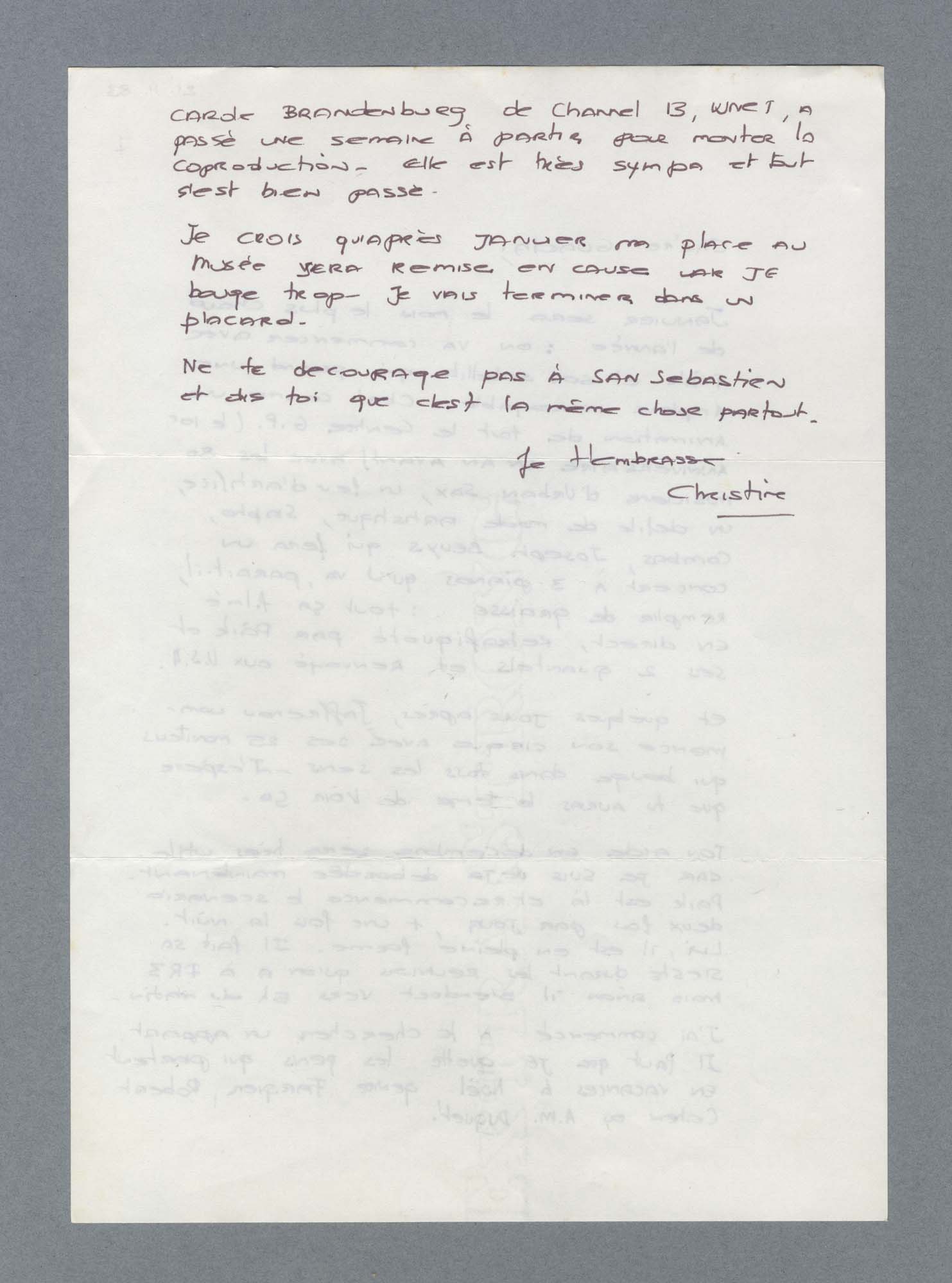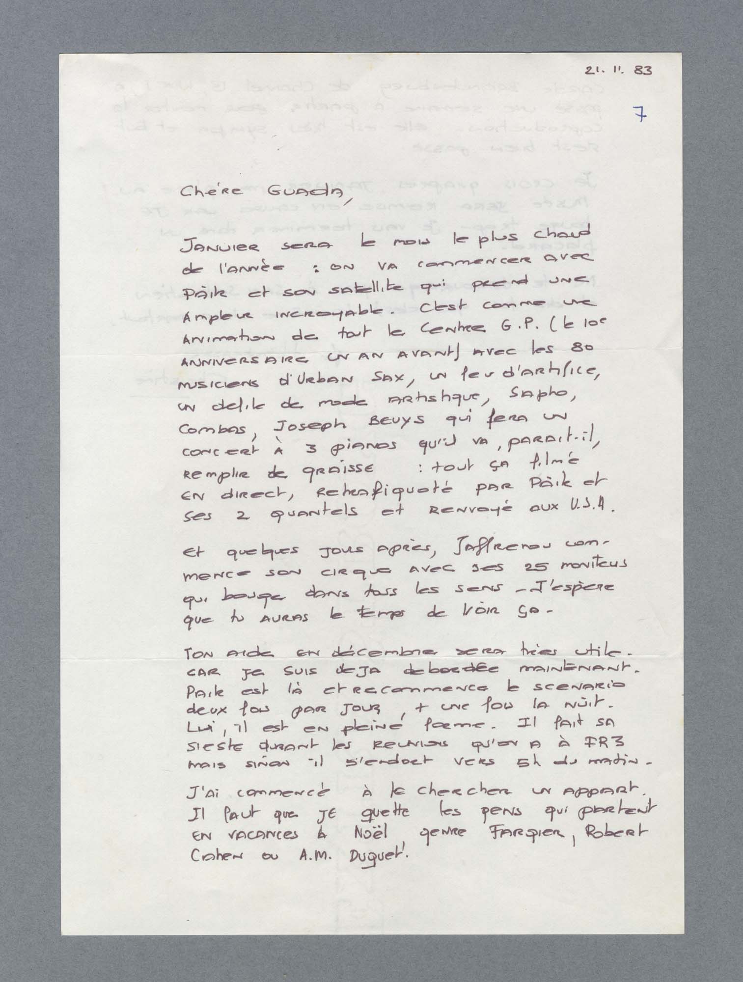 Carta escrita por Christine Van Assche a Guadalupe Echevarria el 21 de noviembre de 1983. El entusiasmo de Van Assche por Nam June Paik es palpable, ya que la instalación que el artista lanzaría por satélite en el Centro Pompidou en enero de 1984 le lleva a asegurar que este iba a ser “el mes más caluroso del año”. Además, Van Assche destaca que Michel Jaffrenou realizaría en el mismo centro su Electronique Video Circus, un espectáculo que el artista llevaría unos meses más tarde al Festival de Video de San Sebastián. En la última parte de la carta es posible apreciar como la curadora del Pompidou teme por su puesto de trabajo. Archivo Festival de San Sebastián.