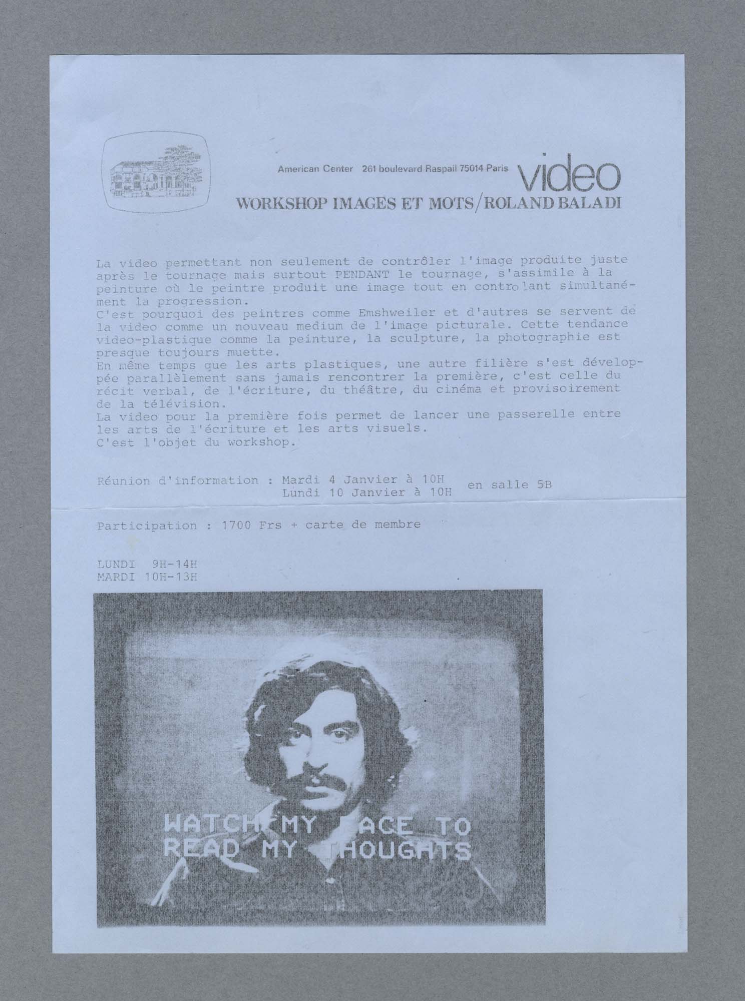 Tanto en el caso de Stein como en el de Van Assche, esta voluntad de convertir el video en un medio accesible cristalizó en la realización de talleres, que habían observado por primera vez en el Festival de Video Montbéliard y en los que los artistas realizaban una pequeña estancia en alguno de los centros para presentar su obra e impartir lecciones sobre su acercamiento a este formato. John Sanborn, Gary Hill o los ya mencionados Nam June Paik y Bill Viola fueron algunos de los artistas que desfilaron por el Pompidou y el Centro Americano, y que aprovecharon sus instalaciones para llevarlos a cabo. En el caso del Pompidou, el estudio que poseían “principalmente para rodar documentales” podía ser usado por los artistas “que no podían permitirse los recursos profesionales” que el estudio sí tenía, mientras que el Centro Americano tenía “unas pocas cámaras” y una “máquina de edición dentro de un armario” que permitían “llevar a cabo talleres todo el rato” y que además prestaban a los estudiantes que no tenían otra manera de acercarse a este medio. De este modo, tanto quienes impartían los talleres como quienes los recibían podían aprovecharse de su realización, algo que para Stein tenía “un alcance muy interesante” del que por aquel entonces “no era plenamente consciente”.