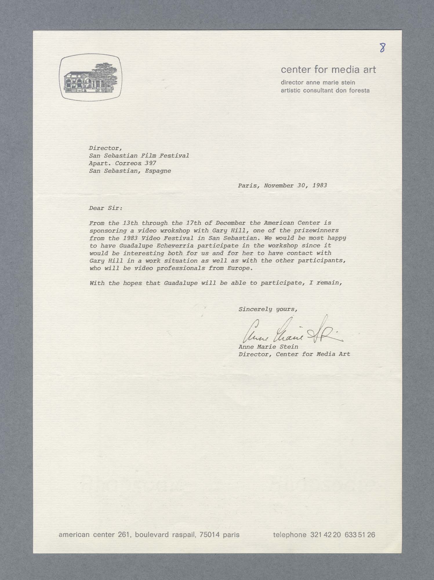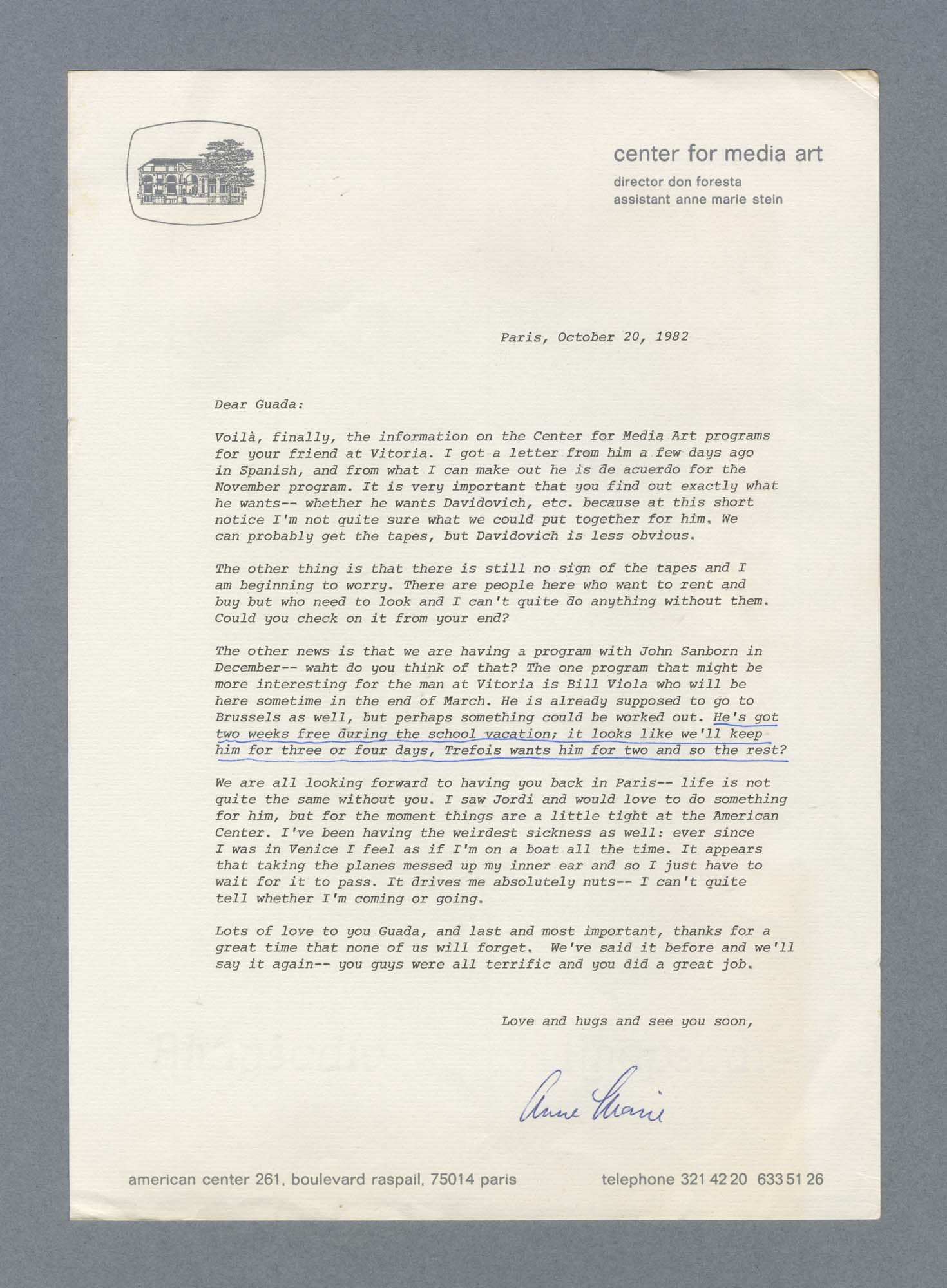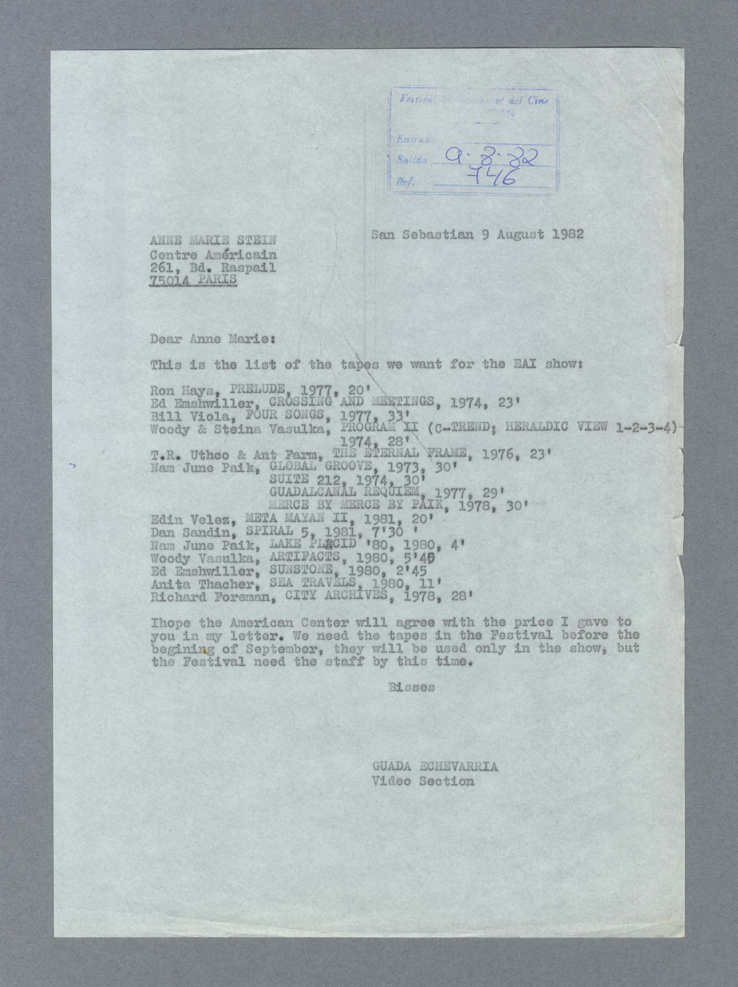 Diferente correspondencia entre Anne-Marie Stein y Guadalupe Echevarria. En la primera carta, datada el 9 de agosto de 1982, Echevarria le pide a Stein las cintas que quiere para el “show” de Electronic Arts Intermix (EAI). En la segunda carta, del 20 de octubre de 1982, Stein escribe a Echevarria para intentar cuadrar fechas en las que artistas americanos como Bill Viola o John Sanborn estarán en Europa, con el fin de que puedan acudir a España. El final de esta carta se da en un tono muy personal. Archivo Festival de San Sebastián.