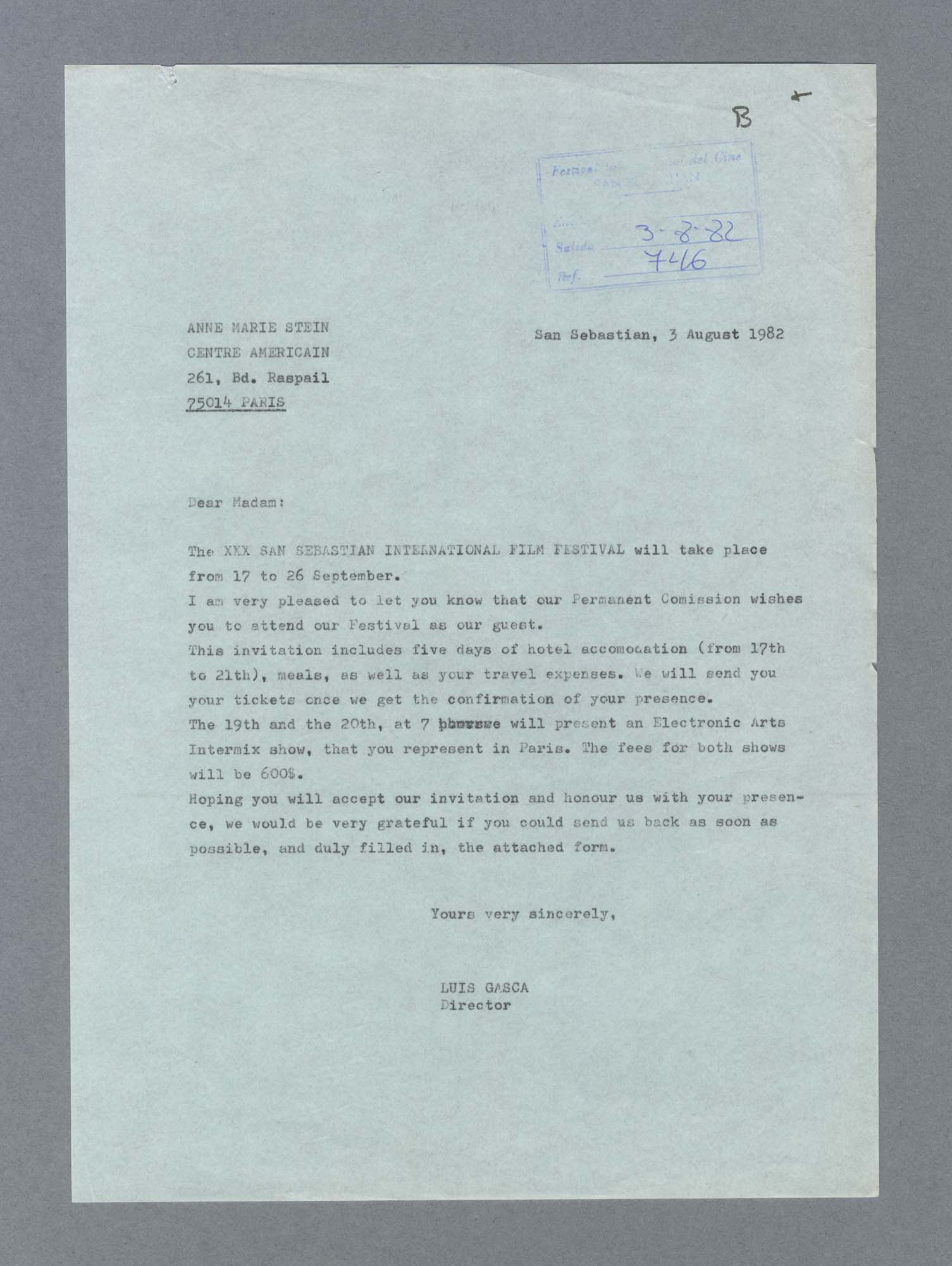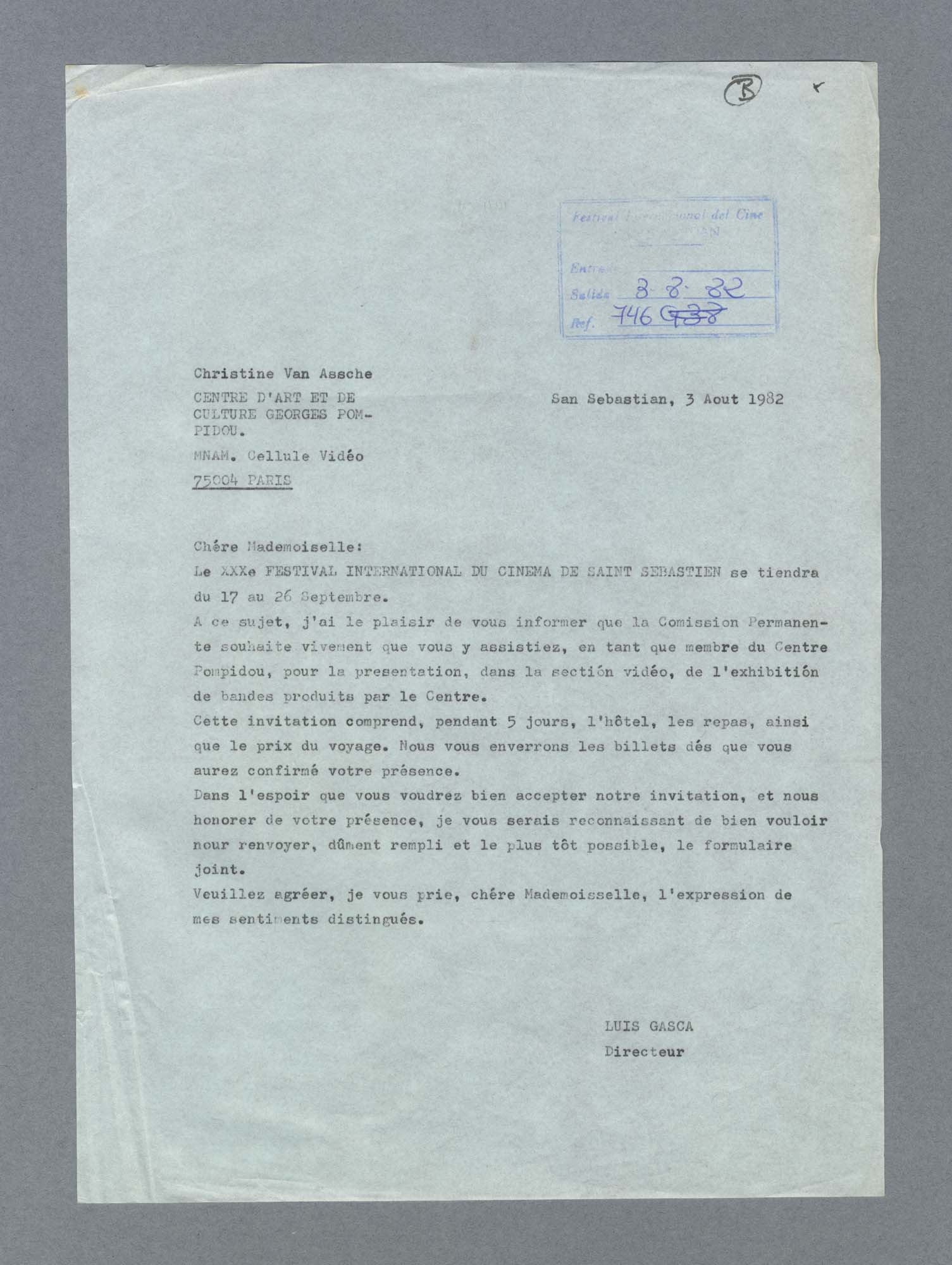Cartas en las que Luis Gasca invita, respectivamente, a Anne-Marie Stein y Christine Van Assche a la primera edición del Festival de Video, datadas el mismo día, 3 de agosto de 1982, y en las que se puede observar como el director del Festival de San Sebastián asegura a ambas la pensión completa en su estancia en la ciudad. Archivo Festival de San Sebastián.