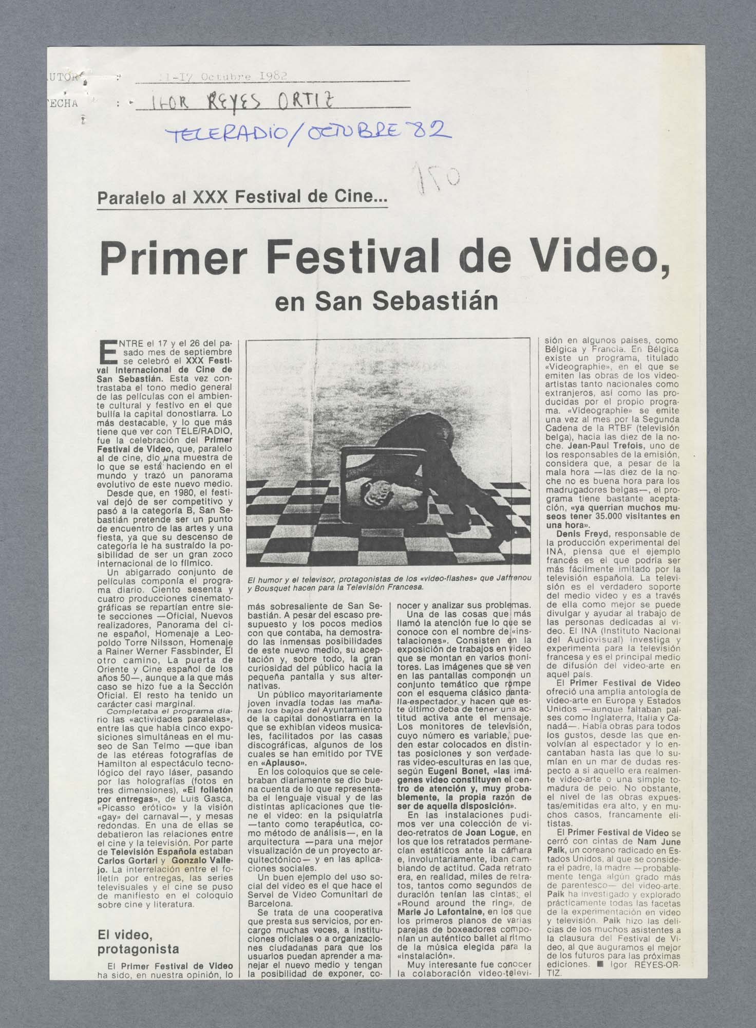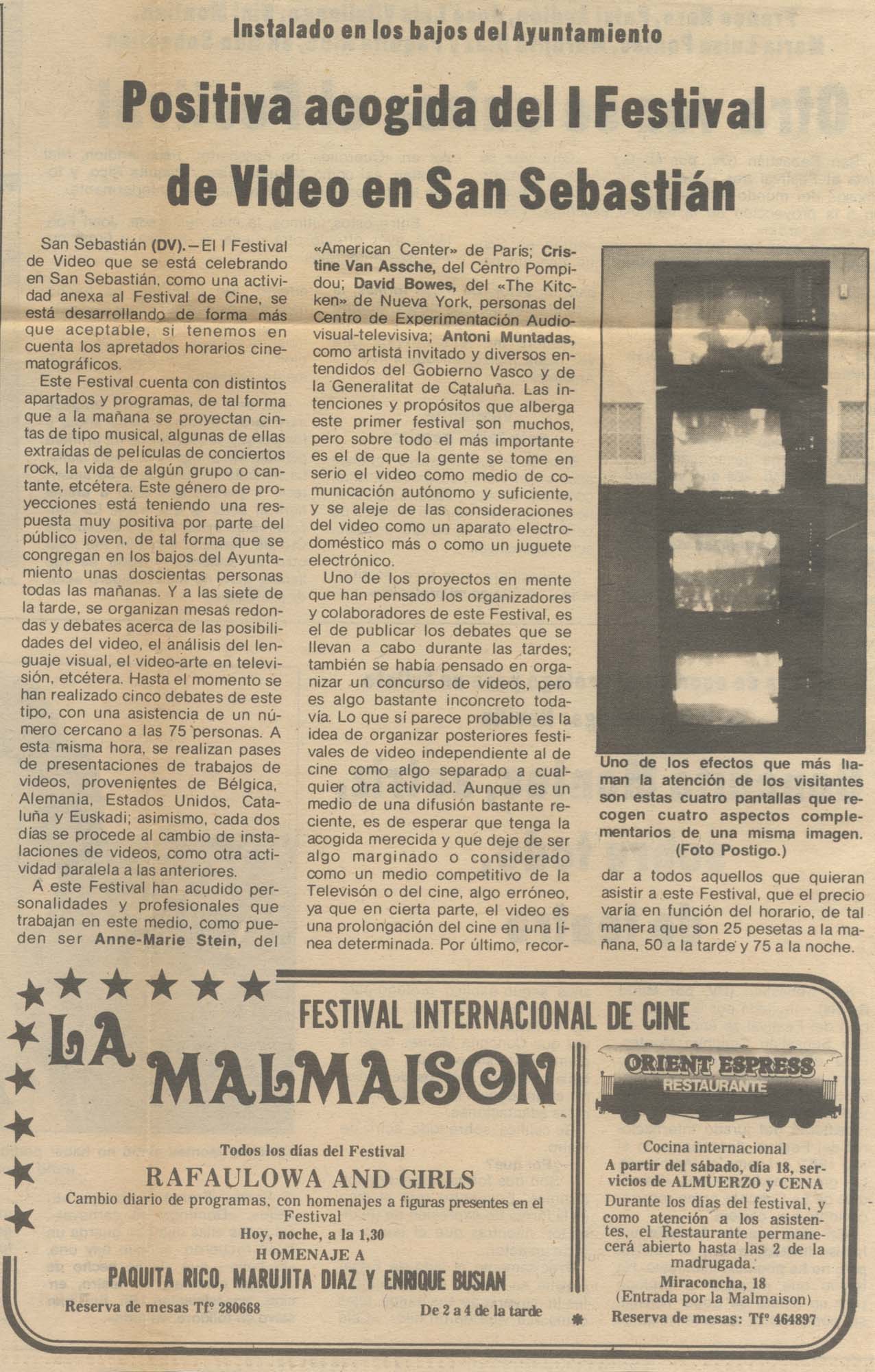 De acuerdo con lo que tanto Stein como Van Assche relatan, parece que el Festival de Video se encontraba en sintonía con los retos que el medio presentaba en los primeros años de la década de los 80. Considerado todavía como un formato menor dentro del panorama audiovisual, situarlo junto al cine con éxito y atraer algunas de las figuras más relevantes que trabajaban con él parecían un buen camino para que la manera en que era recibido por el público comenzara a cambiar. Aunque nuestro trabajo dentro del archivo del Festival de San Sebastián no indique que hubiera unanimidad respecto a esta recepción, sí que es posible encontrar varios artículos de prensa donde se muestra el entusiasmo por la experiencia de la exhibición de video. Este es el caso del Diario Vasco, que en la primera edición hablaba de una “positiva acogida” de la muestra, en la que destacaba que “las intenciones y propósitos que alberga este primer festival son muchos, pero sobre todo el más importante es que la gente se tome en serio el video como medio de comunicación autónomo y suficiente, y se aleje de las consideraciones del video como un aparato electrodoméstico más o como un juguete electrónico” o del medio Teleradio, que la destacaba como “lo más sobresaliente de San Sebastián”, y aseguraba que había logrado despertar una “gran curiosidad del público hacia la pequeña pantalla y sus alternativas”.