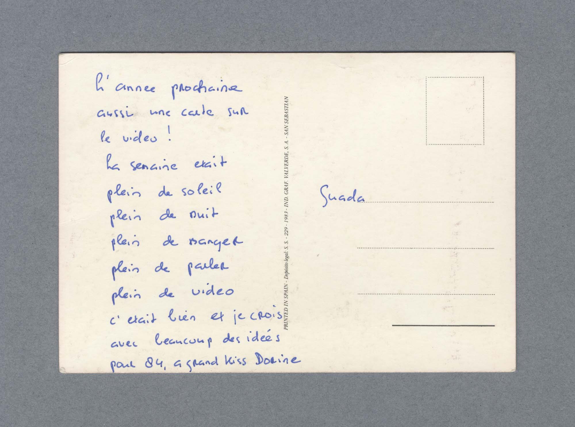 Postal dedicada a “Guada” por Dorine Mignot tras la II edición del Festival de Video, una experiencia que define con un poema: “La semana estuvo / llena de sol / llena de noche / llena de comer / llena de hablar/ llena de video”. Archivo Festival de San Sebastián.