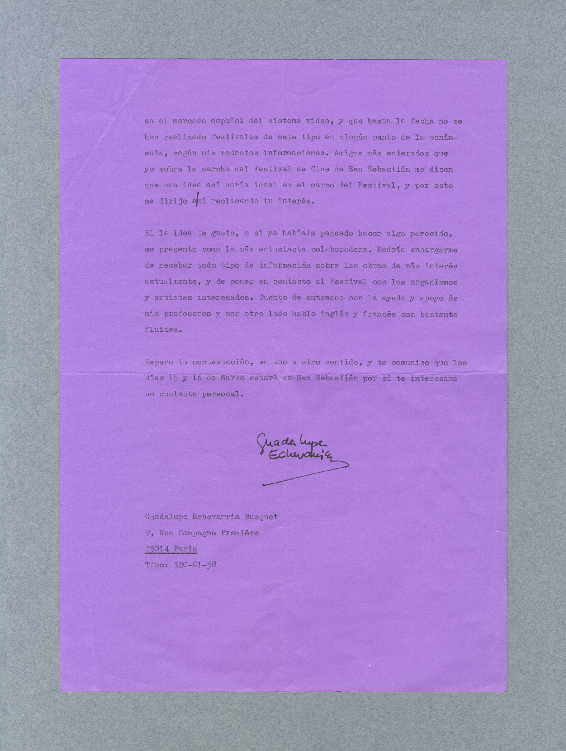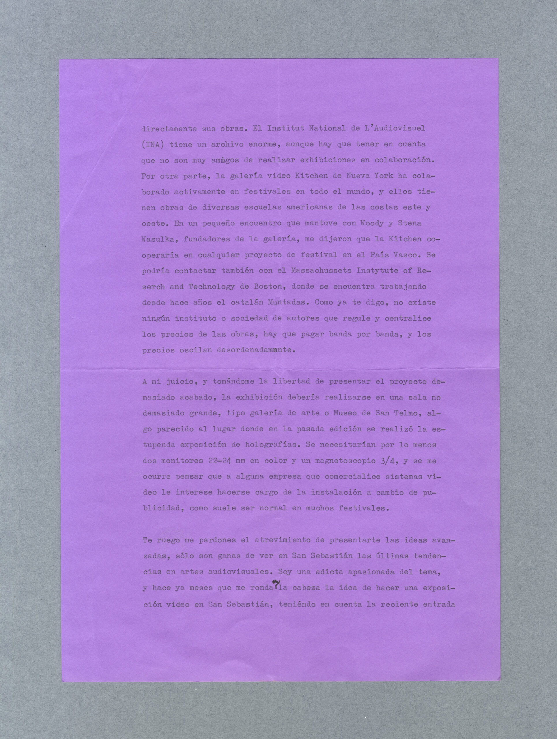 El Festival de Video de San Sebastián comienza con una carta morada. Este fue el color de papel escogido por Guadalupe Echevarria el 2 de marzo de 1982 para plasmar y hacer llegar a Luis Gasca, entonces director del Festival de San Sebastián, su propuesta de “realizar una exhibición de video dentro del marco del Festival”, asegurando que los festivales de cine de Cannes y Venecia ya habían llevado a cabo esta experiencia “con un notable éxito”. [1] Además, el certamen supondría un evento totalmente novedoso en España, donde el video ya había comenzado a ser exhibido pero que, sin embargo, no contaba aún con una muestra que estuviera estructurada con la forma de un festival. La resonancia con grandes festivales de la así llamada “categoría A” otorgada por la Federación Internacional de Asociaciones de Productores Cinematográficos (FIAPF) (un estatus que San Sebastián ansiaba recuperar tras su pérdida en 1980), la seriedad y compromiso de la propuesta y su carácter innovador fueron argumentos suficientes para impulsar ese mismo año la primera edición, que transcurriría de forma paralela al festival de cine en un total de tres ediciones entre 1982 y 1984.