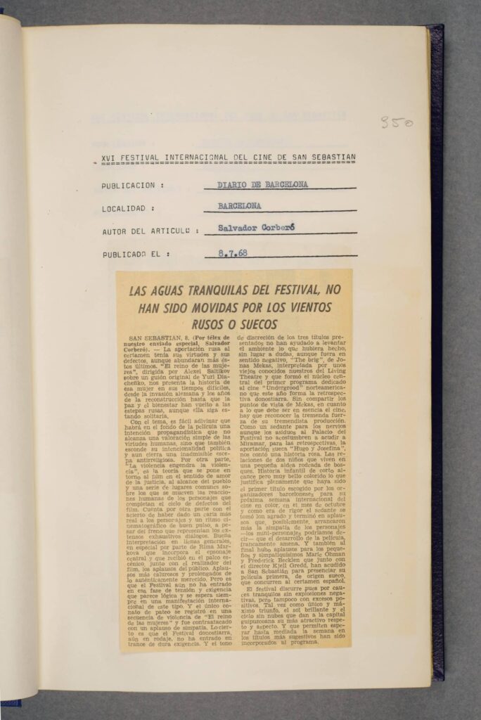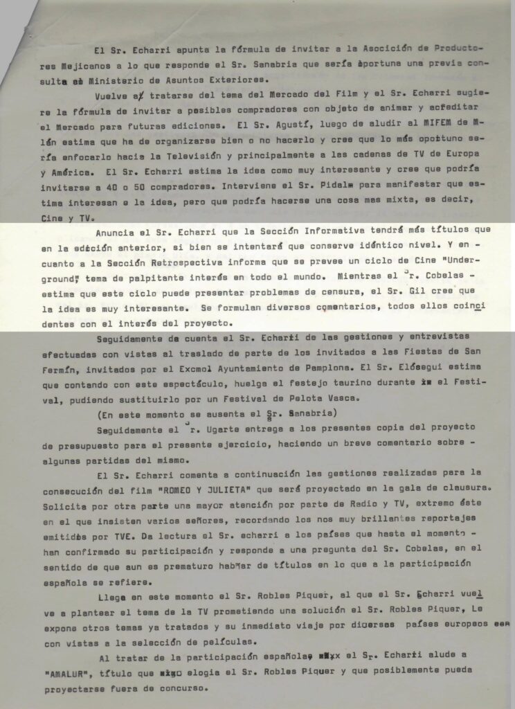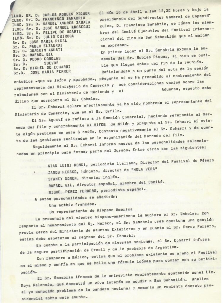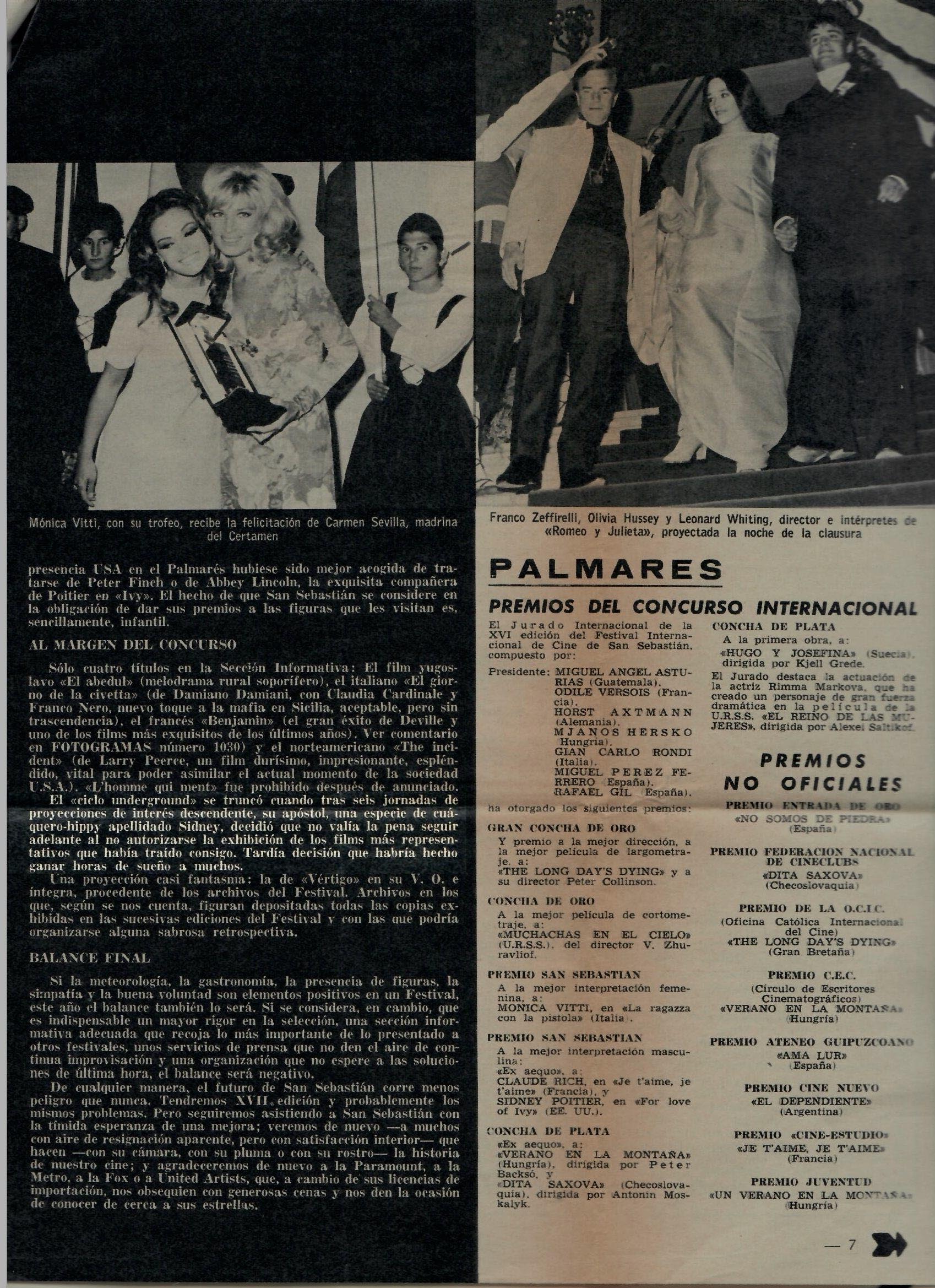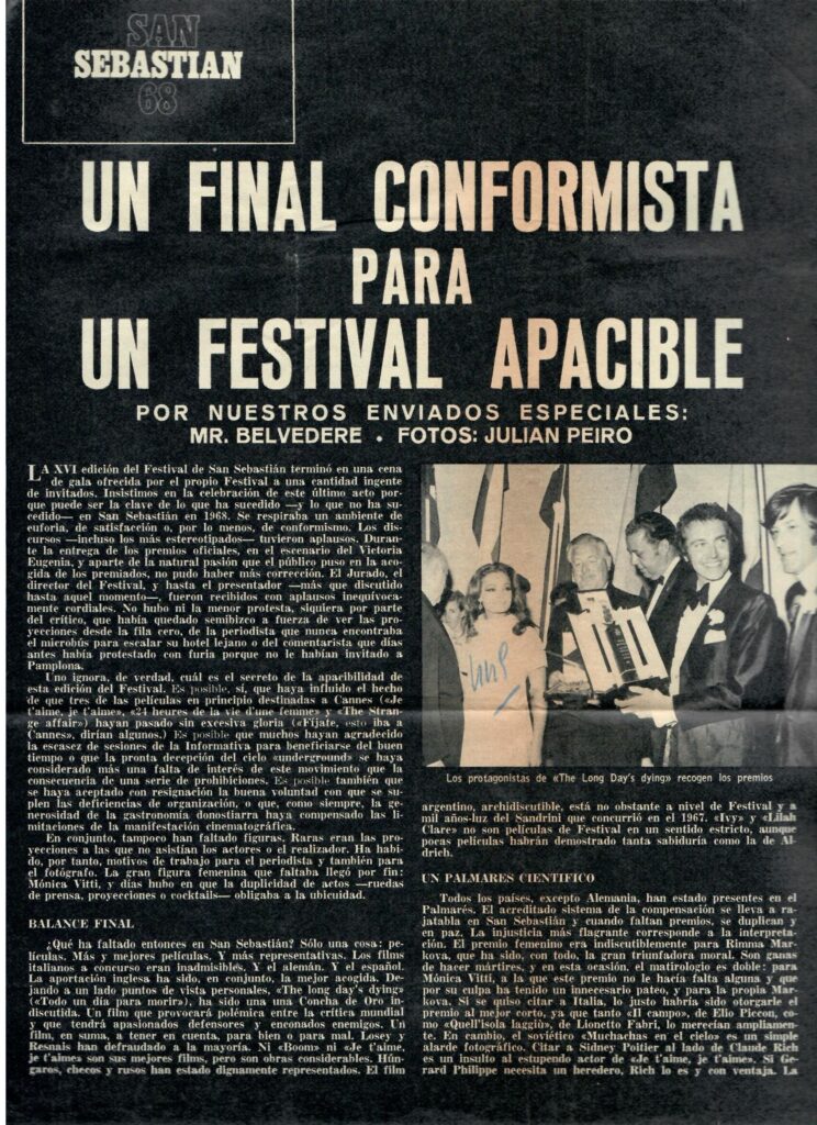 [6] En palabras del periodista Alfonso Sánchez: «Las más de treinta horas de films son visionados por los miembros del comité de selección Martialay y Clemente» El Diario Vasco, 9 de julio de 1968.