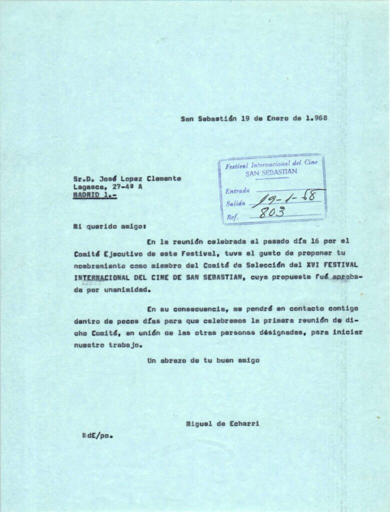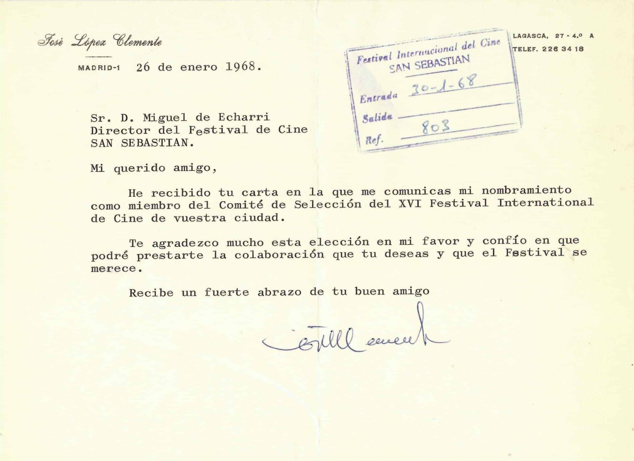 En enero de 1968, López Clemente se incorporó por primera vez al Comité de Selección del Festival de San Sebastián, por invitación del entonces director del certamen, Miguel de Echarri. A continuación, se reproduce la primera correspondencia mantenida entre ambos.