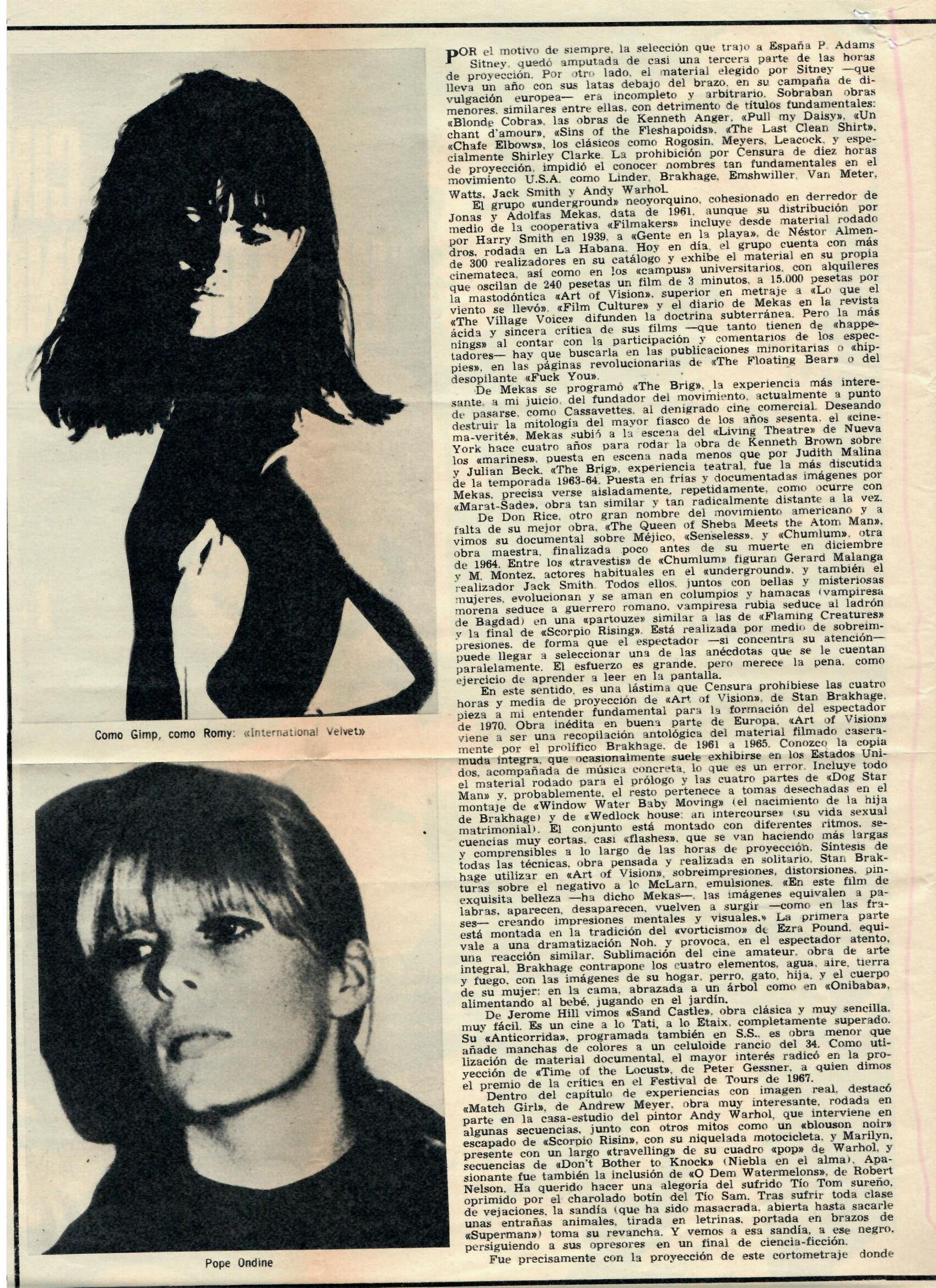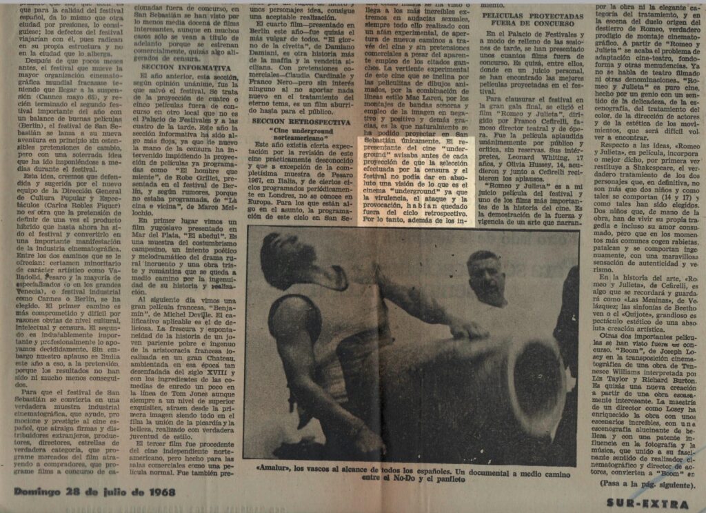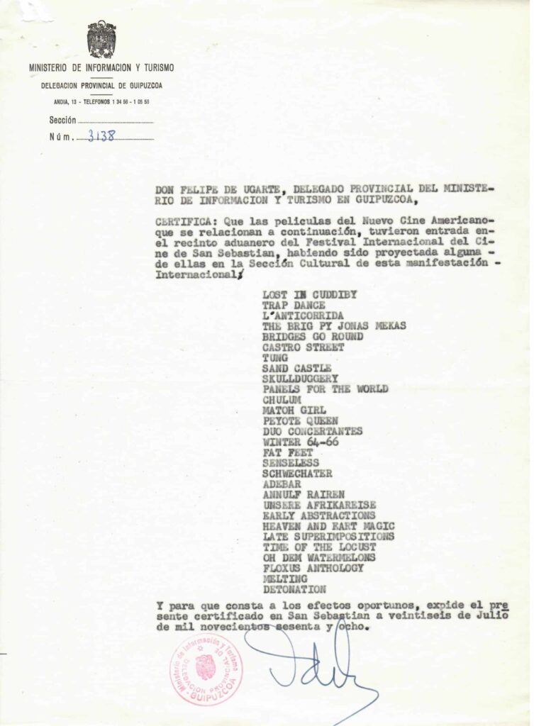 La edición del Festival de San Sebastián de 1968 mostró en su Sección Oficial una programación que cumplía con las expectativas de forma aproblemática, sin ninguna ostentación renovadora, más allá de la complejidad que rodeó el estreno de Ama Lur. Por otro lado, tal y como se puede comprobar en los registros del acta del Comité Ejecutivo reproducida más arriba, el ciclo del New American Cinema fue, en sus inicios, definido por los propios organizadores como un «tema de palpitante interés en el mundo». De esta forma, la retrospectiva se convirtió enseguida en un intento cosmético del régimen por apropiarse de una modernidad transformadora que posicionase al país internacionalmente con un aura de apertura. Sin embargo, las imágenes proyectadas supusieron una colisión insostenible para las estructuras de la dictadura. La paradoja de la «oposición controlada» saltó por los aires. El New American Cinema fue mutilado y censurado en nombre de la ideología nacional católica del franquismo.