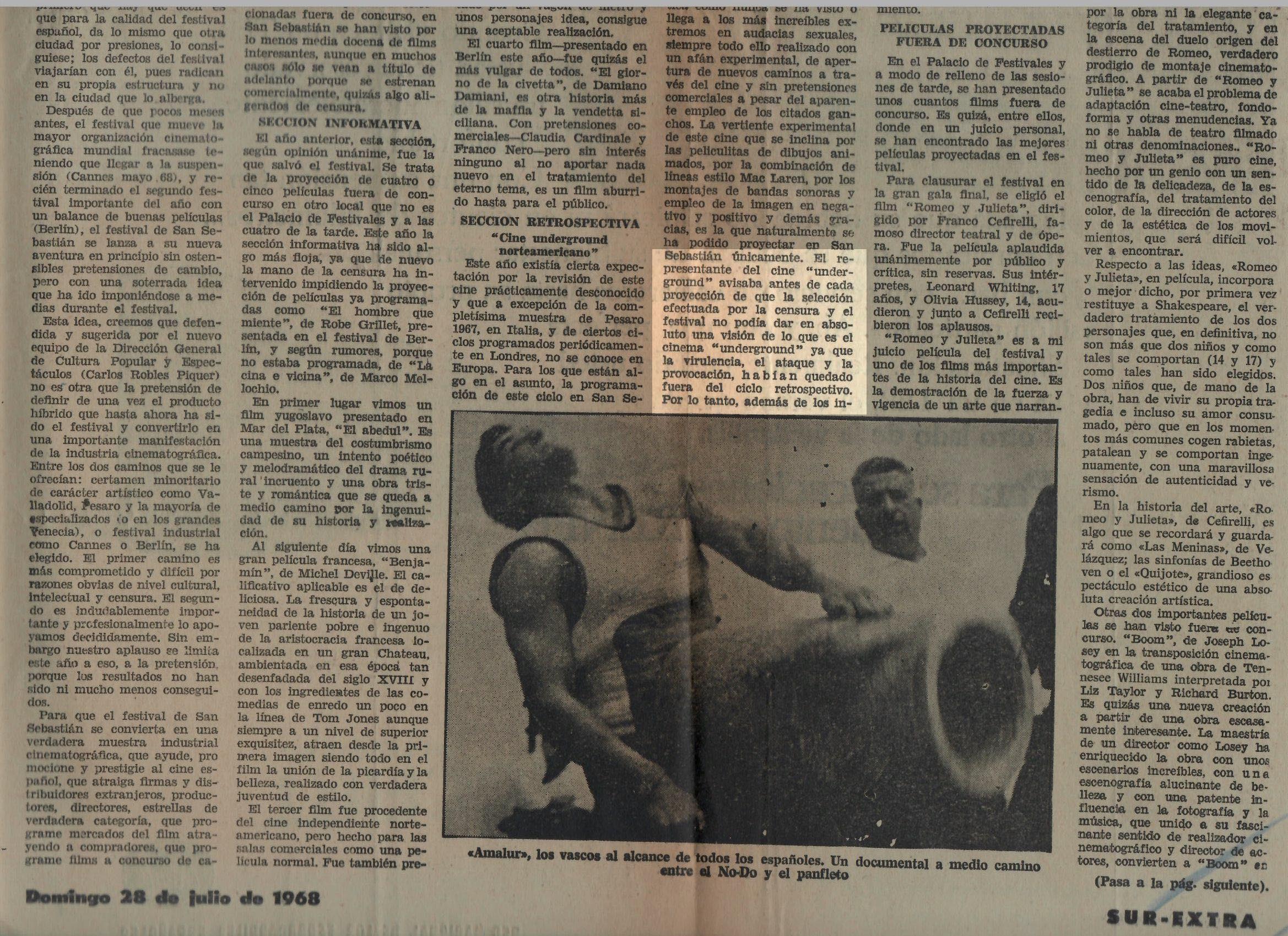 En la decimosexta edición del certamen donostiarra, celebrado en 1968, sucedieron varios acontecimientos relevantes que, sin el falso aperturismo al que aspiraba el régimen, jamás se habrían llevado a cabo: por un lado, el estreno internacional de la cinta vasca Ama Lur de Néstor Basterretxea y Fernando Larruquert, y, por otro, la inclusión de un ciclo de películas dedicado al cine de vanguardia estadounidense, el New American Cinema, programado en la Sección Retrospectiva.