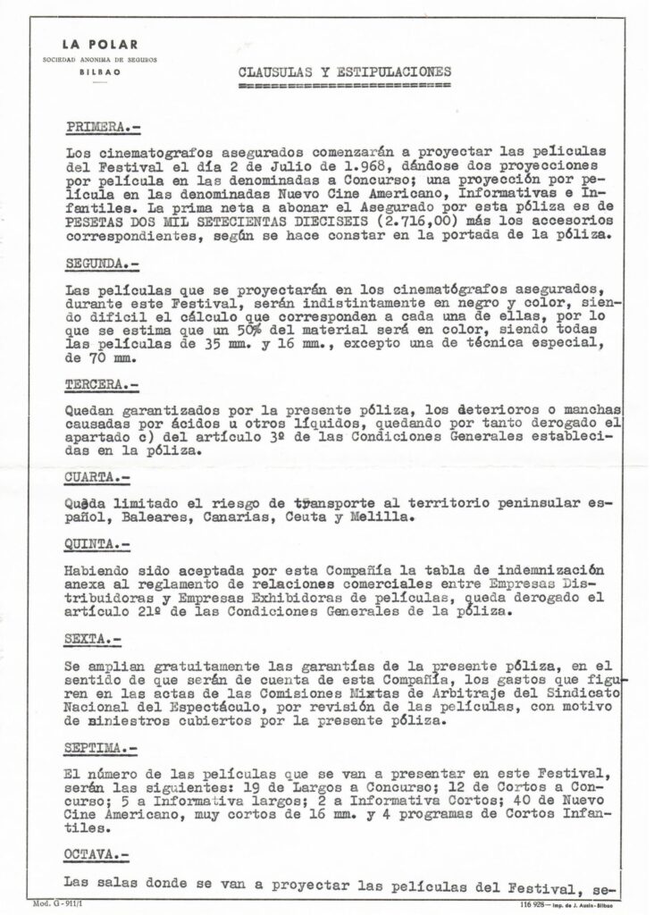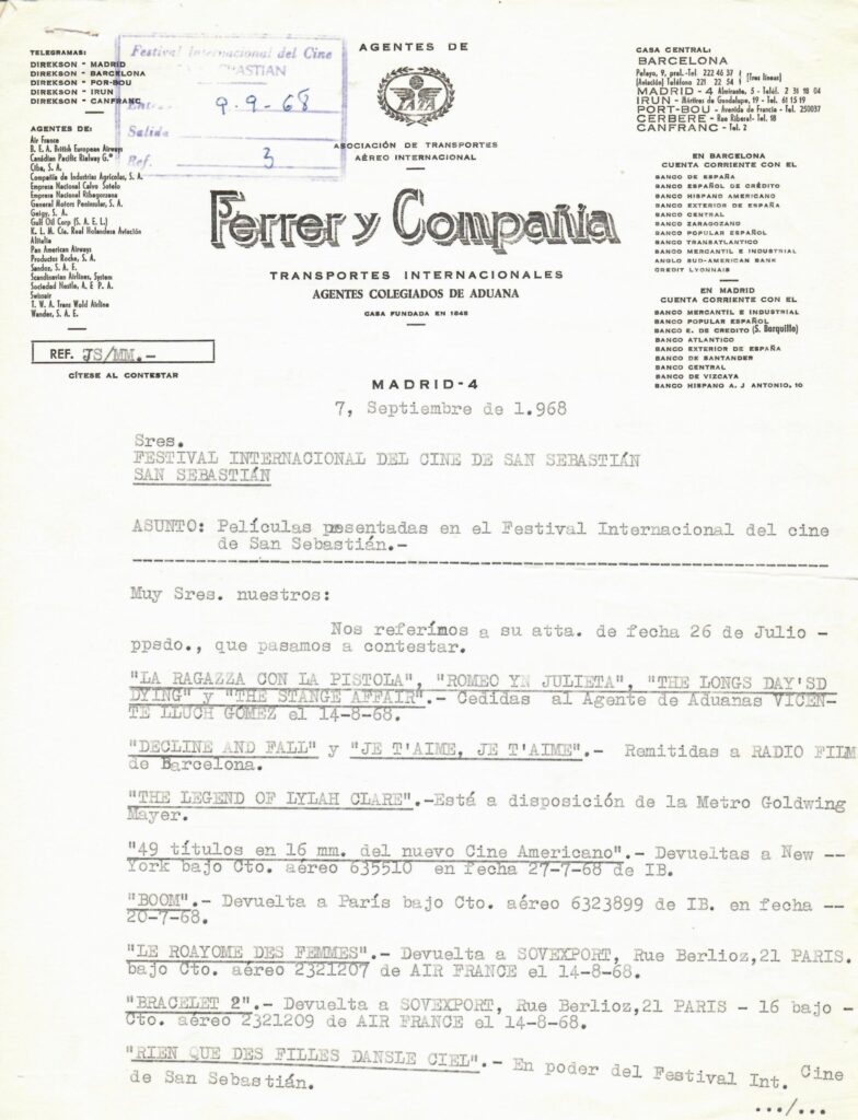 Al menos, algunos documentos administrativos conservados en el archivo del Festival, como certificados de seguros, facturas o documentos de aduanas, revelan un desajuste en los números: de San Sebastián salieron más películas de las que se proyectaron, incluso, más de las que entraron al recinto aduanero por vías oficiales.