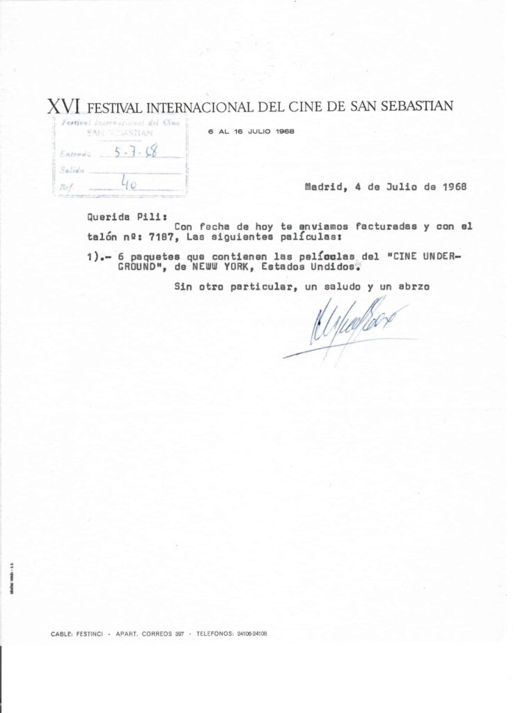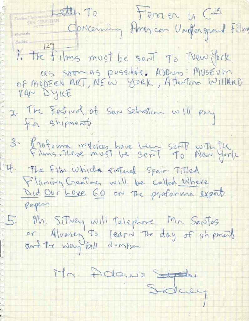 Sea como fuere, resulta indudable el papel crucial que jugó San Sebastián como puerto de salida de la totalidad de películas que cargaba consigo Adams Sitney en su segundo viaje por Europa. A continuación se reproduce una carta manuscrita del neoyorquino en la que, horas antes de abandonar la capital guipuzcoana, solicita a la empresa de transportes y mensajería contratada por el Festival un cambio de título a una de sus películas custodiadas, con el objetivo de sacarla del país y poder introducirla de forma desapercibida en Nueva York. Se trata de Flaming Creatures (Jack Smith, 1963) una pieza que no solo le había traído problemas en Europa sino que estaba censurada en Estados Unidos desde su fecha de estreno. En sus instrucciones, Sitney pidió sustituir el nombre del film por el de otra película que había perdido cuando viajaba por Suecia.[9]